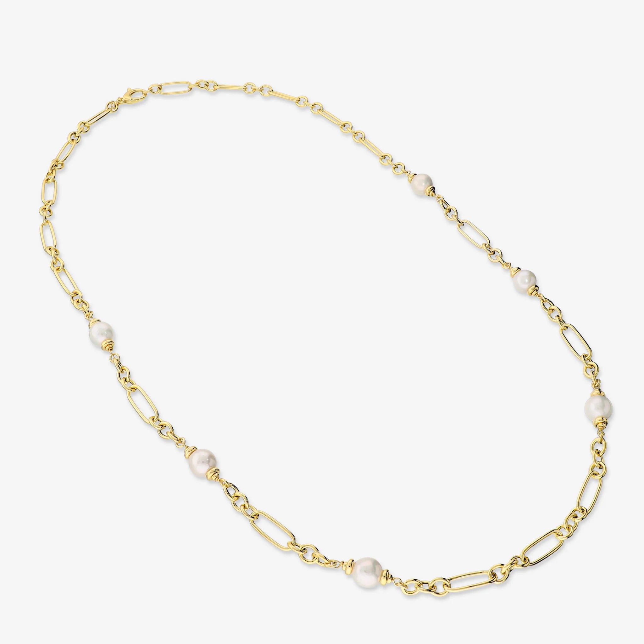 Collana lunga realizzata in lega Golden placcata Oro giallo 18kt. Maglia figaro lucida con perle Ming bianche coltivate d'acqua docle 9/10 mm. Lunghezza 79 cm. Chiusura a moschettone.