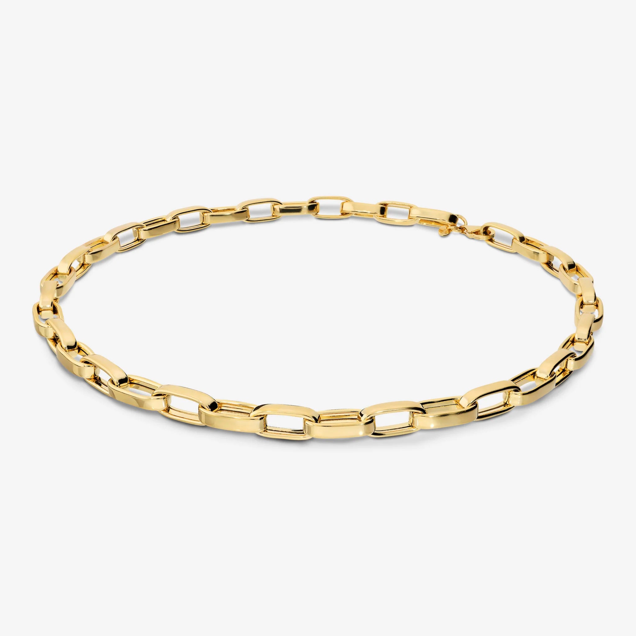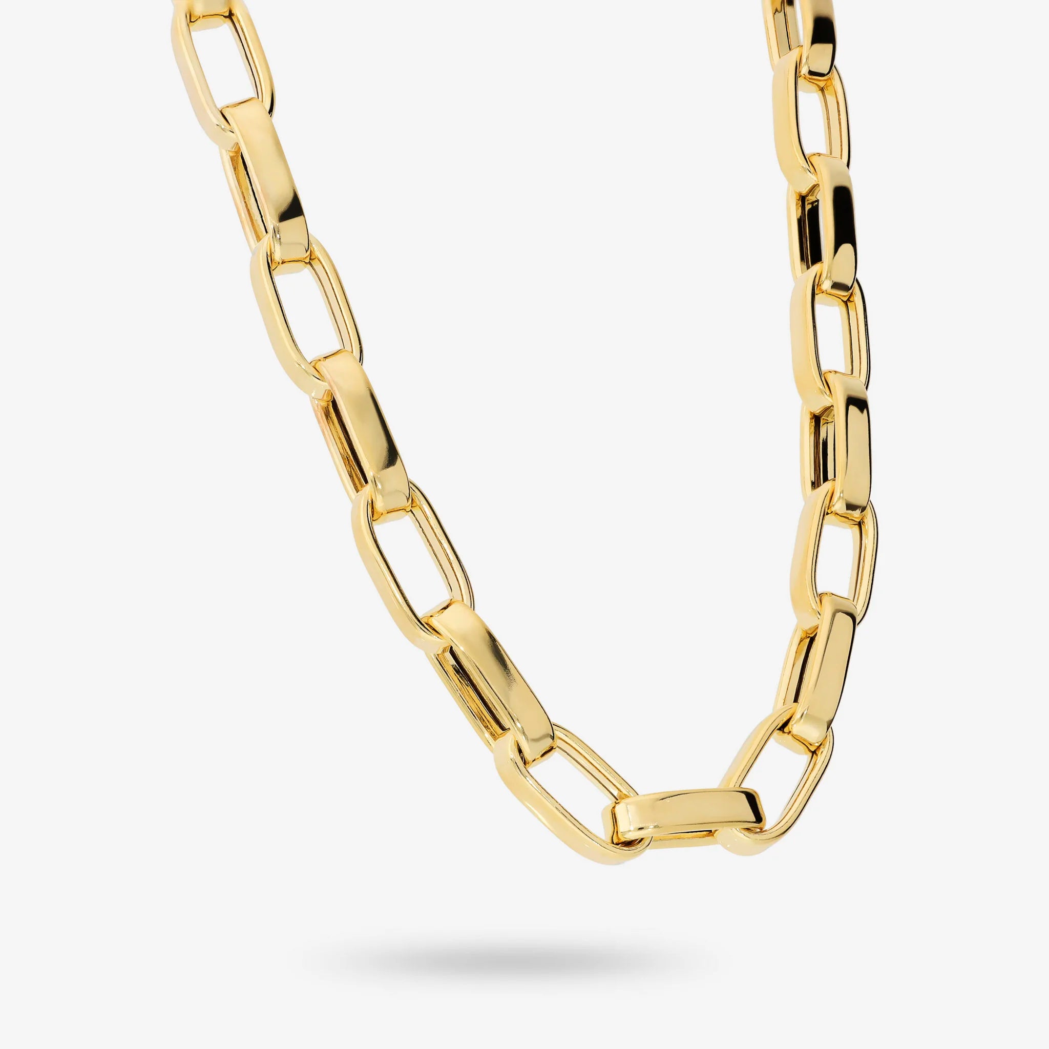 Collana girocollo in Argento 925 placcato Oro giallo 18Kt con maxi maglie ovali allungate. Superficie lucida a specchio. Lunghezza 51 cm. Chiusura a moschettone.