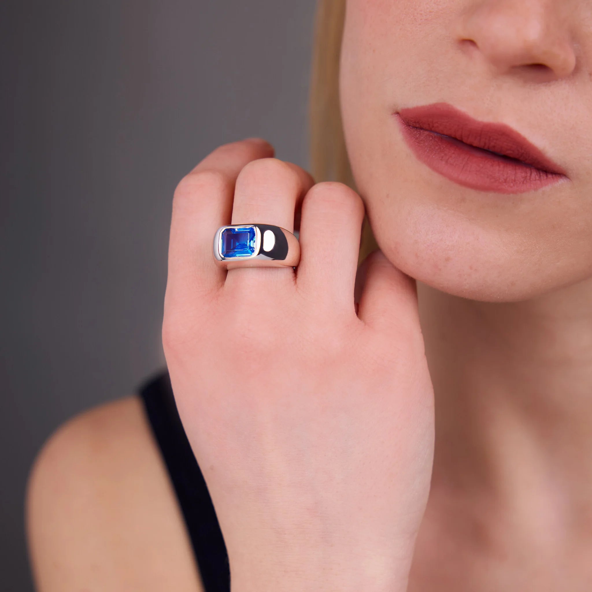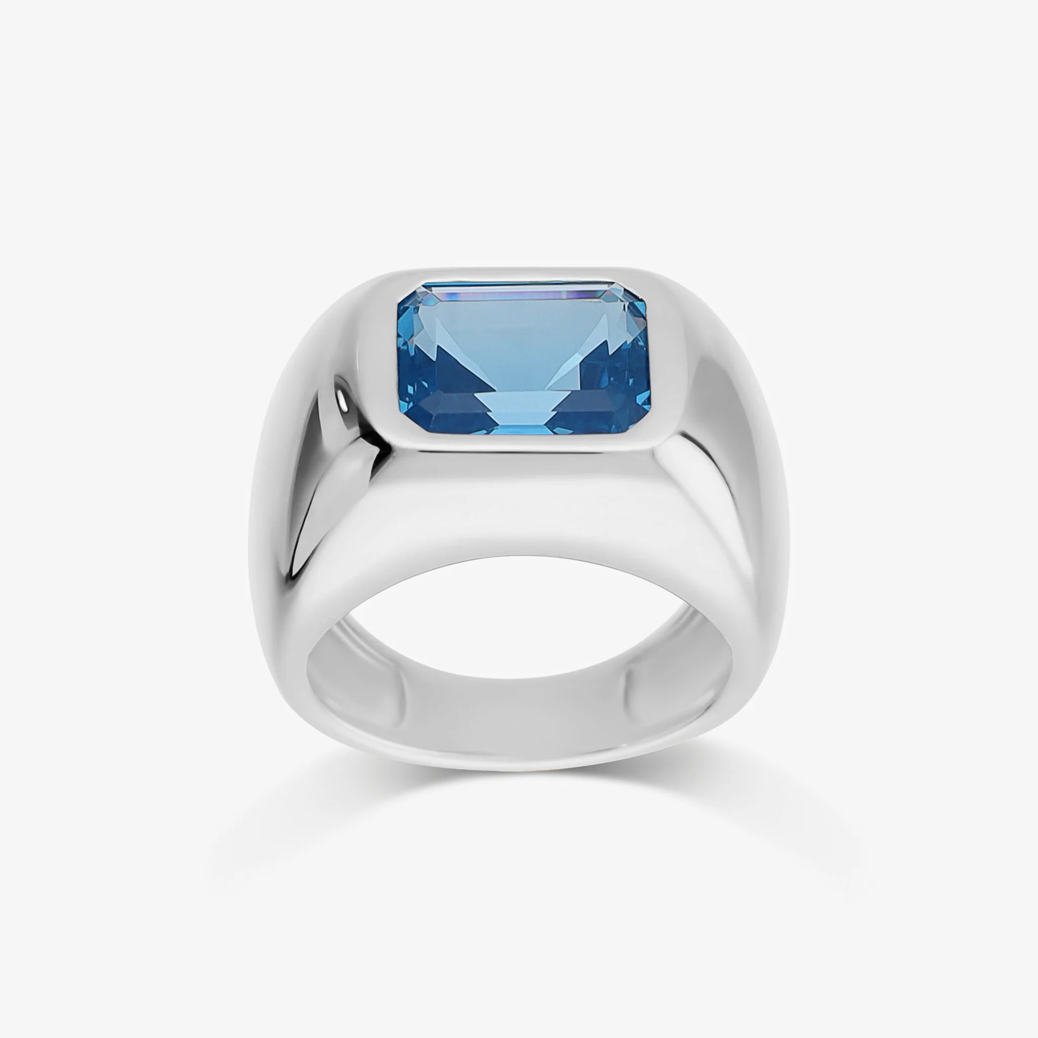Anello chevalier in Argento 925, placcato Platino, con pietra prisma gem blu dal taglio smeraldo (11x9mm). Finitura lucida.