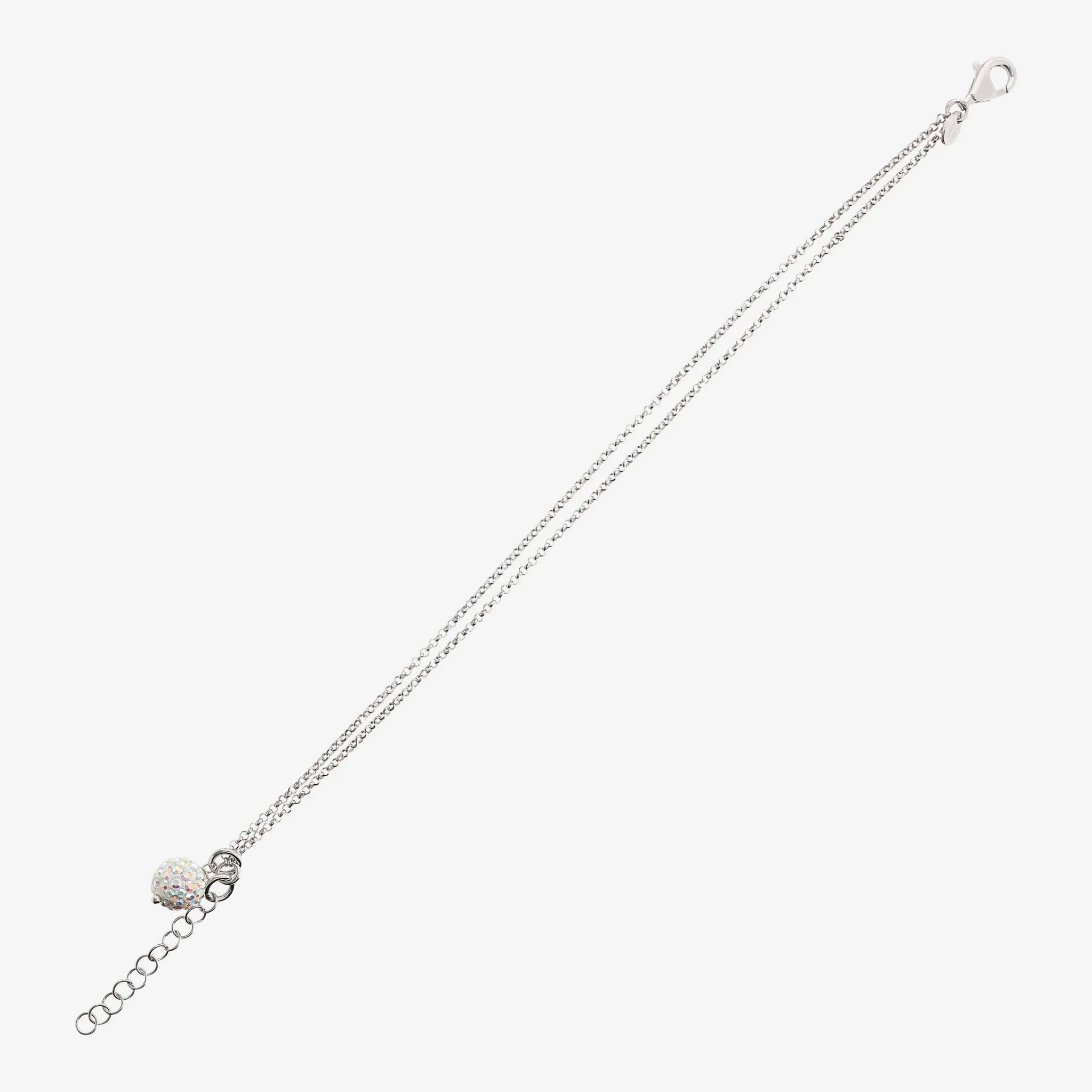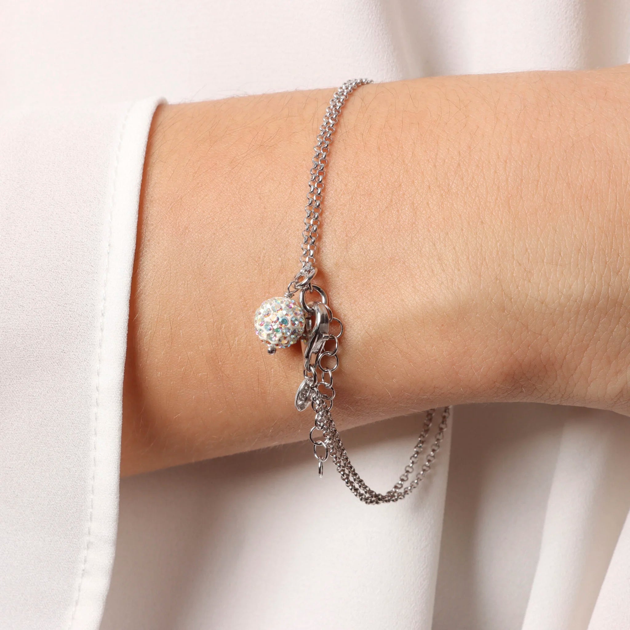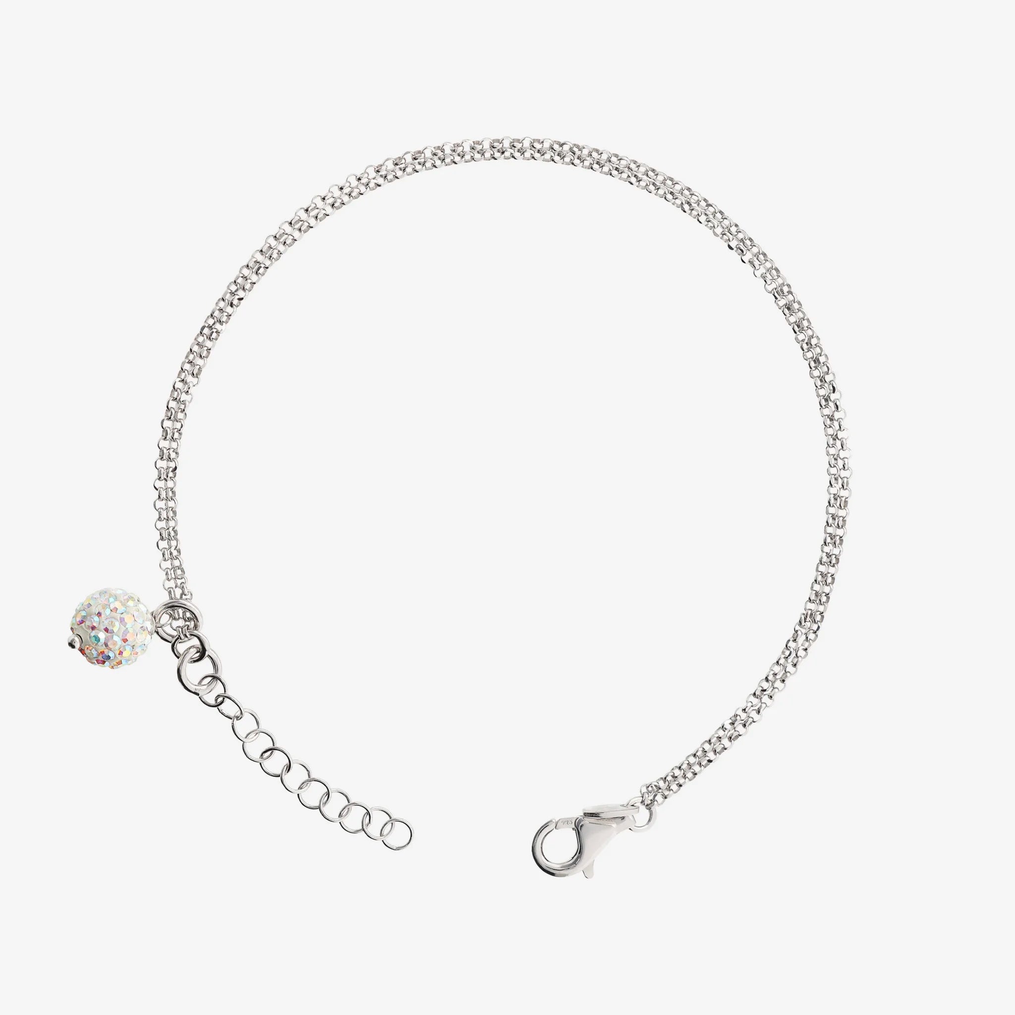 Bracciale con catena rolo in Argento 925, placcato Platino, e ciondolo sferico ricoperto di pavé di cubic zirconia. Lunghezza 18+3cm. Chiusura a moschettone. Argento 925. Placcatura in Platino. Made in Italy. Ipoallergenico e Nickel Free. Peso 5g