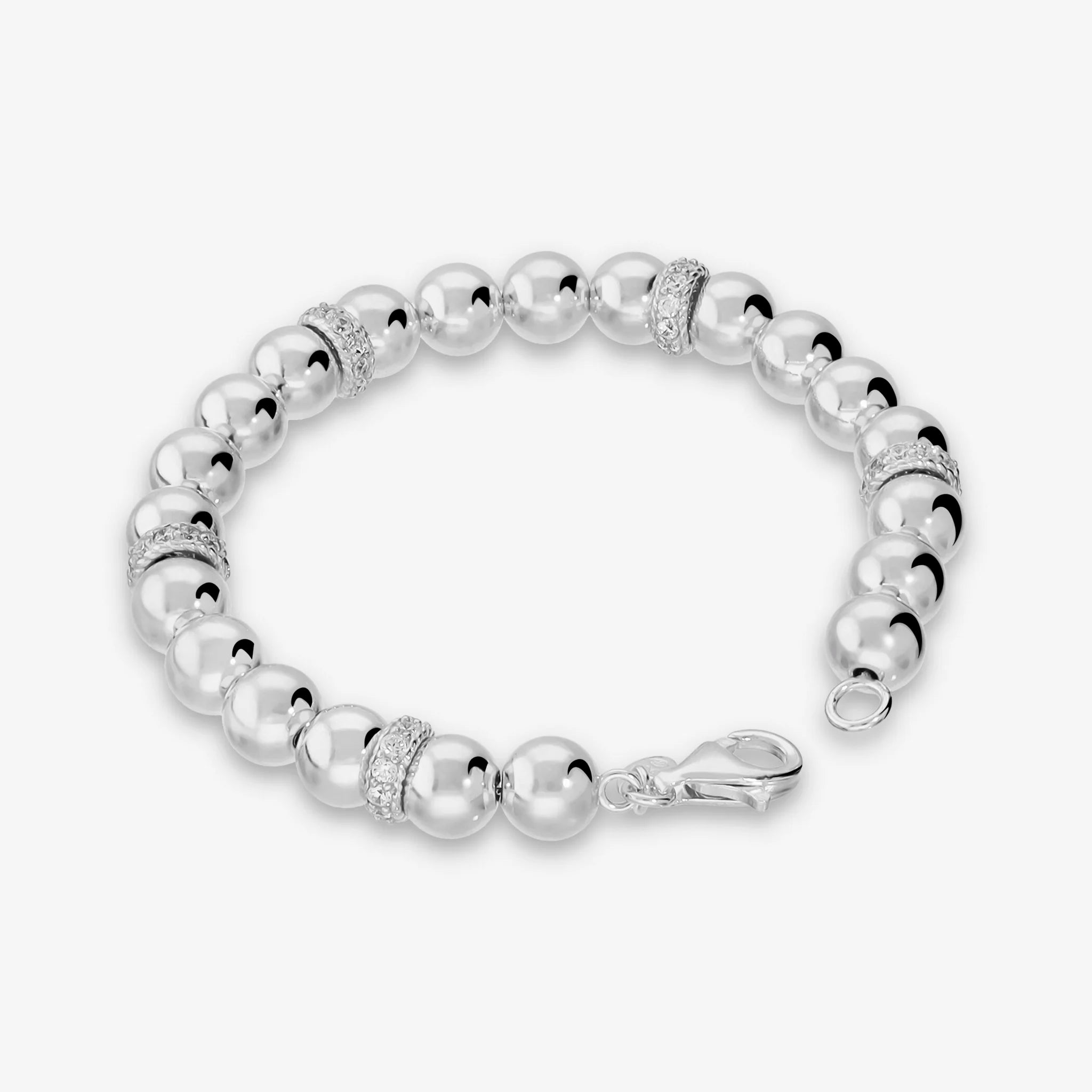 Bracciale in Argento 925 placcato Platino con bead lucide (8 mm) alternate a rondelle con cubic zirconia, qualità 'Luminosa', pari a 1.55ct. Lunghezza 19 cm. Chiusura a moschettone.