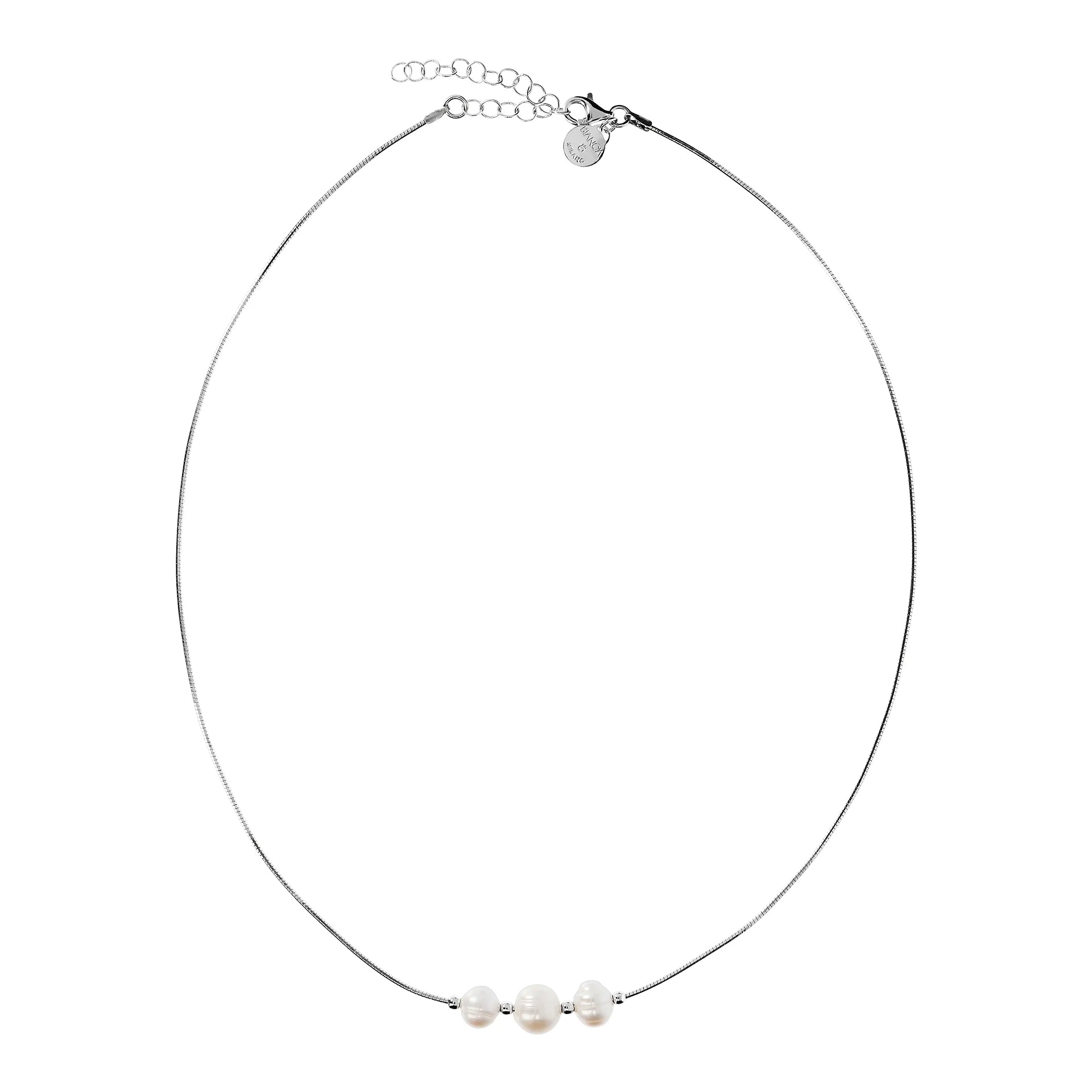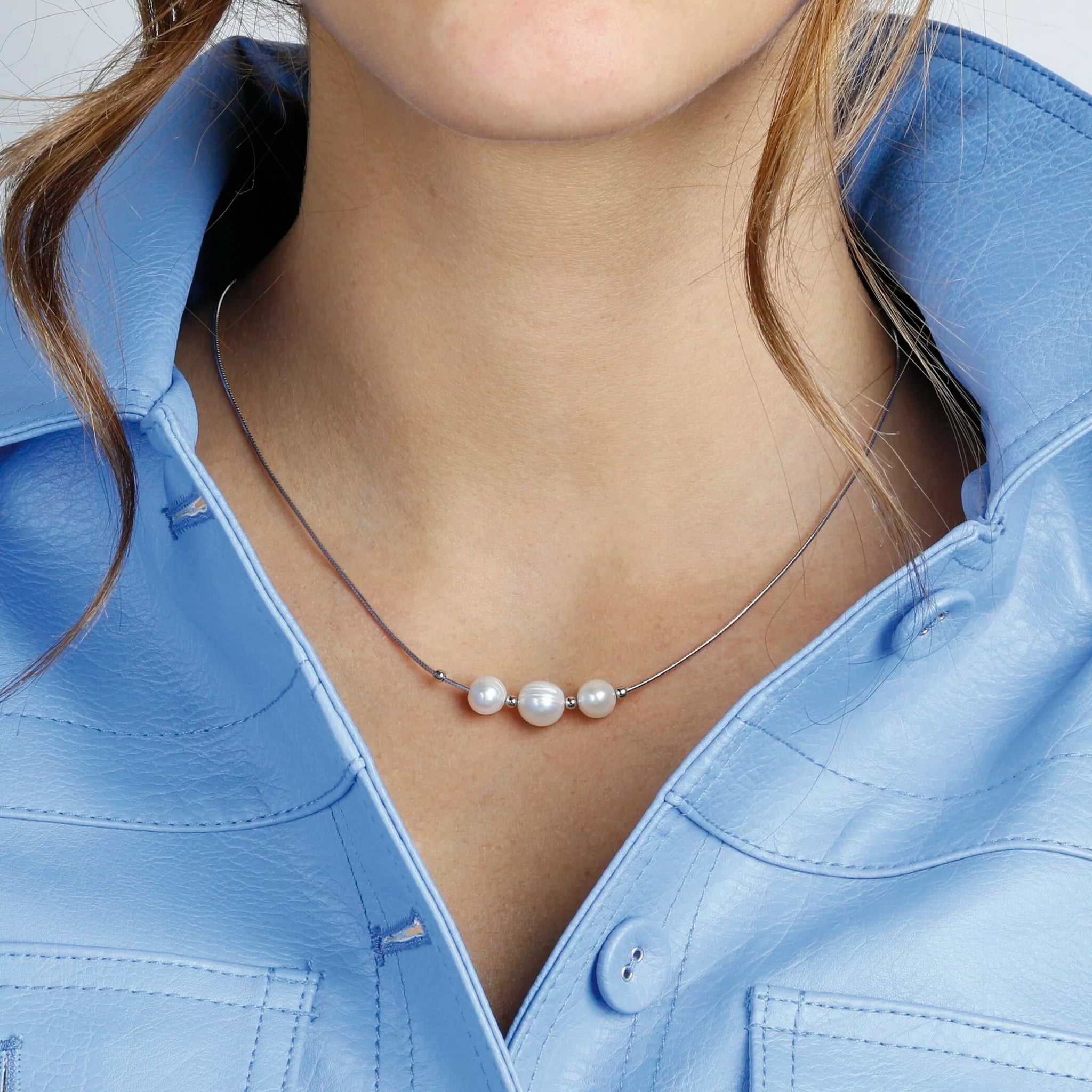 Collana Perlaviva by Milor in Argento 925 con placcatura in platino impreziosita da una catena snake sottile e da tre perle coltivate d'acqua dolce bianche 6/7 mm mentre la terza perla è rigata e preseta un diametro di circa 8 mm; chiusura a moschettone con extender.
