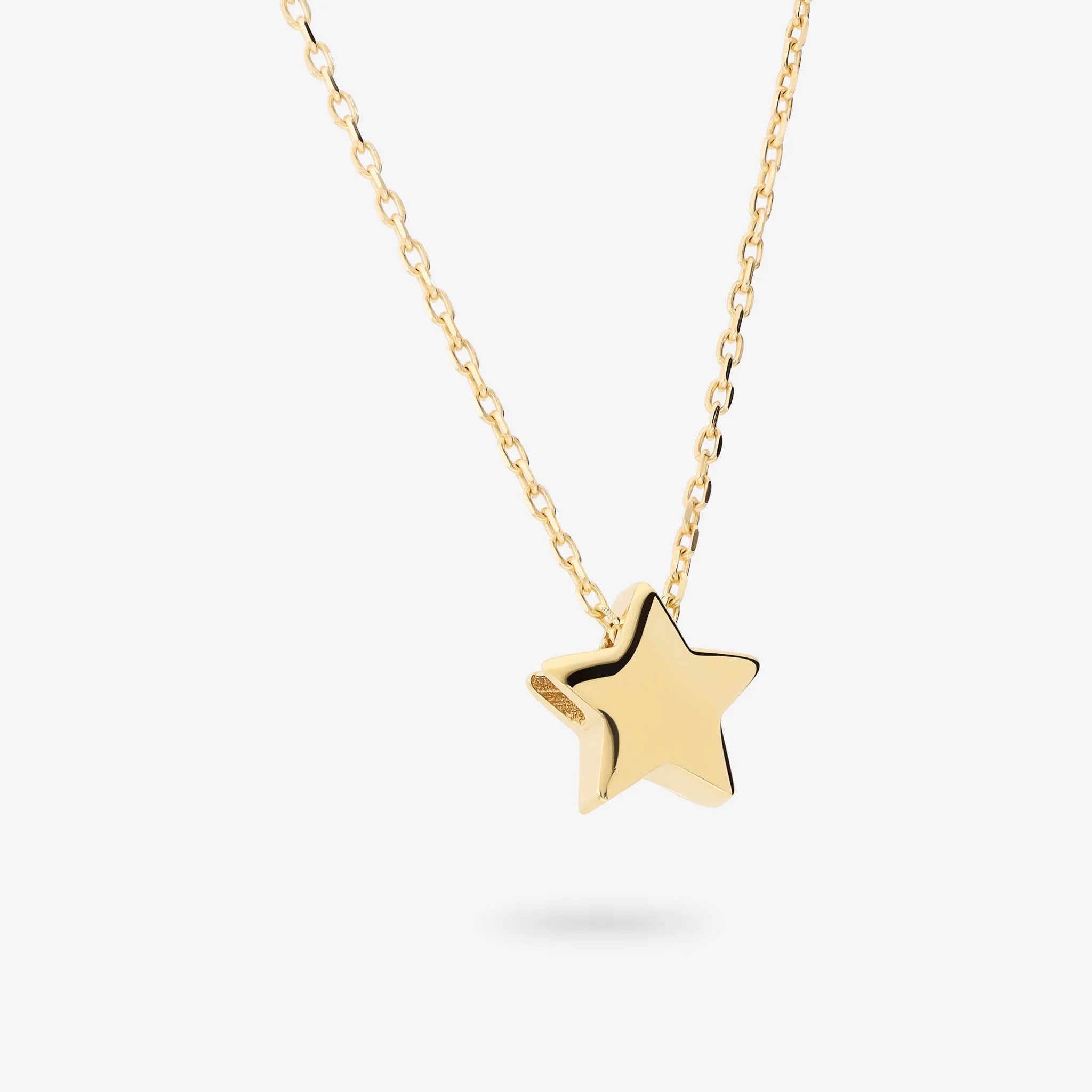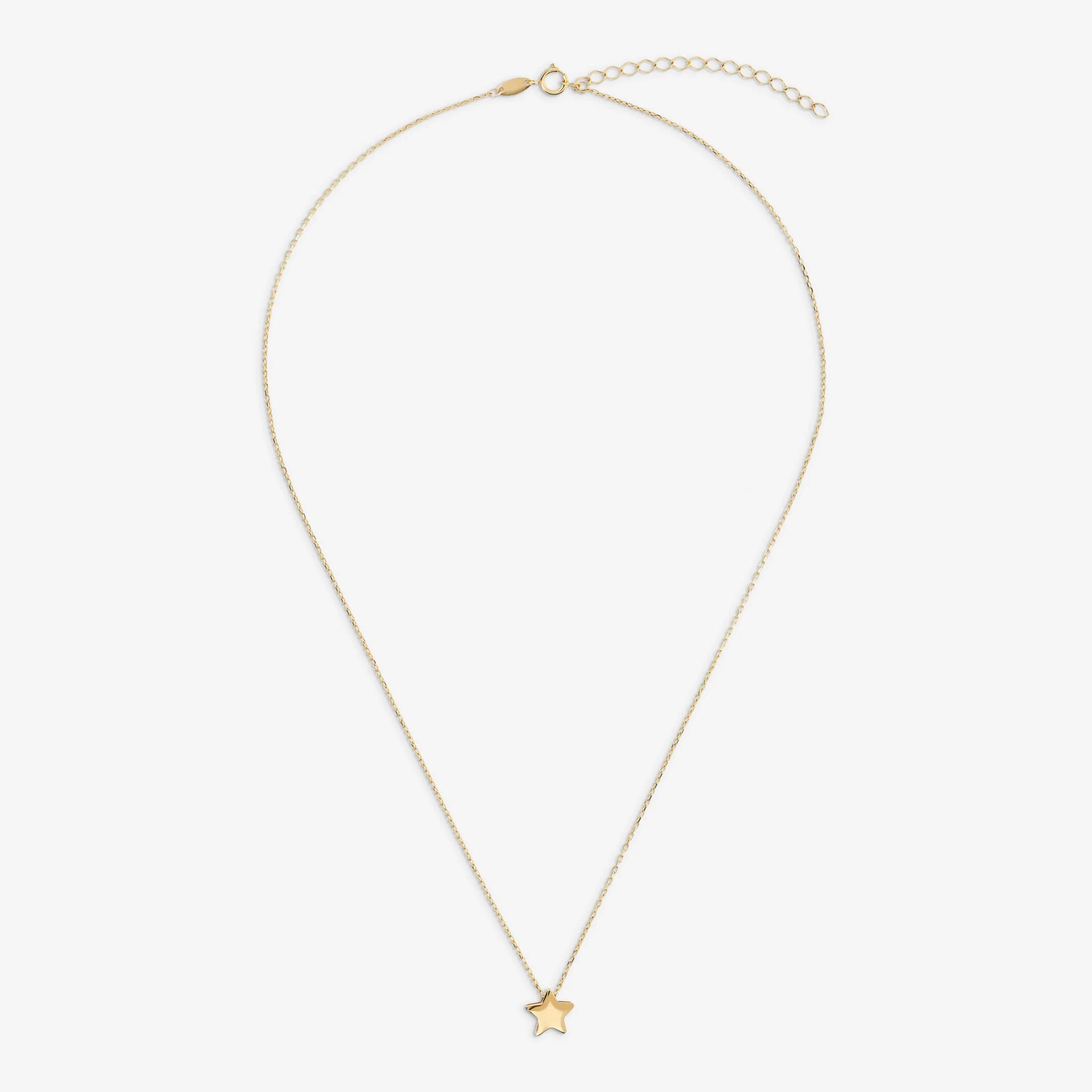 Collana in Oro 375/1000 con maglia brillantina e pendente a forma di stella (8.5x8 mm), finitura lucida. Lunghezza 40+5 cm di estensione. Chiusura ad anello a molla.