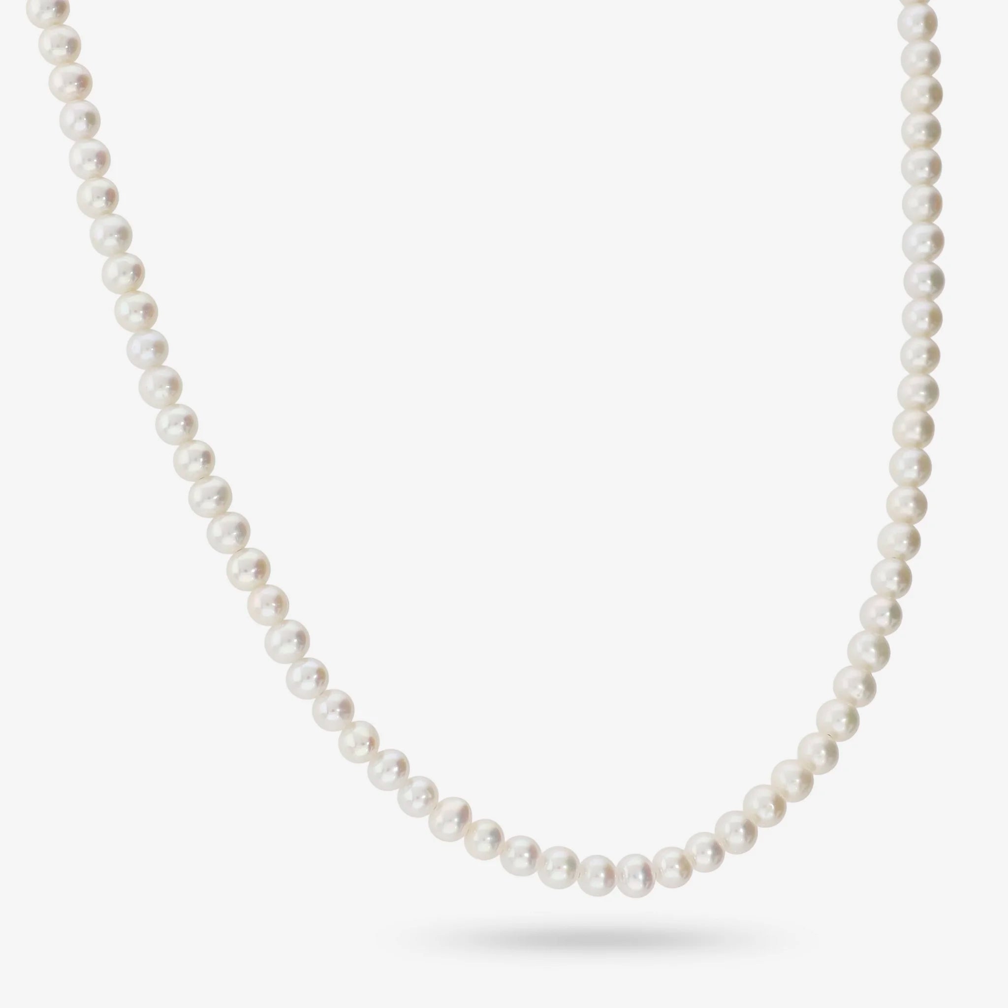Collana girocollo di perle bianche coltivate d'acqua dolce con diametro di circa 4.5 mm. Lunghezza 42+3 cm di estensione. Chiusura ad anello a molla in Argento 925 placcato Oro bianco 18kt.