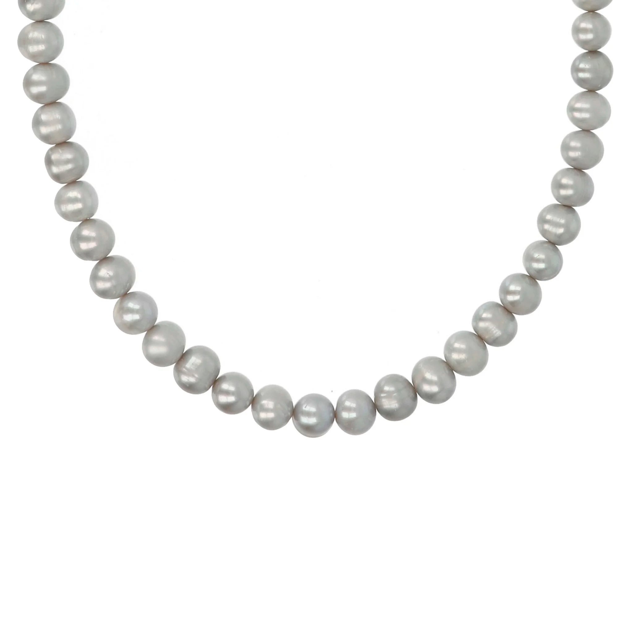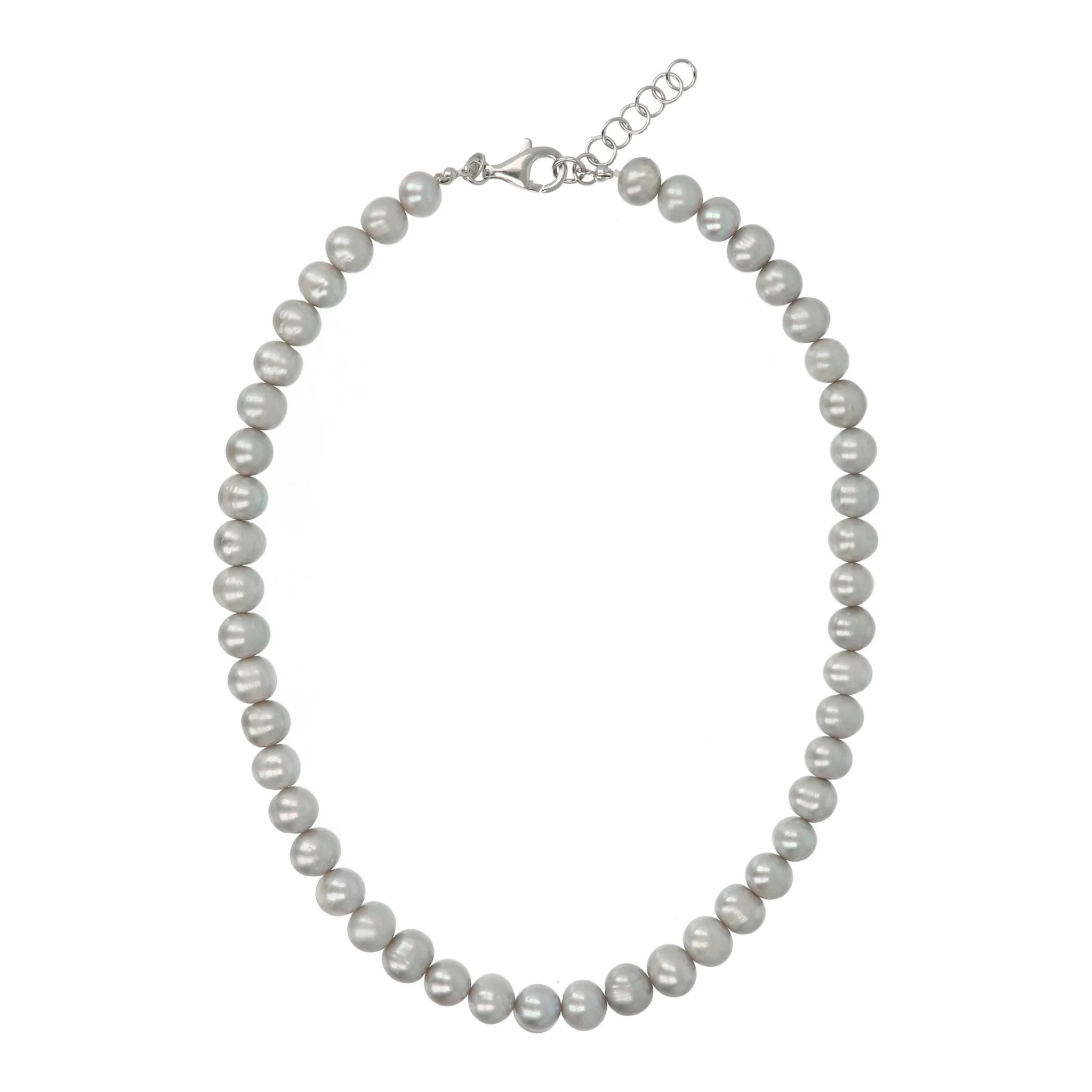 Collana girocollo Perlaviva by Milor con perle cerchiate coltivate d’acqua dolce con diametro di circa 8/9 mm. Lunghezza 42+3 cm. Chiusura a moschettone in argento 925 placcato Oro bianco 18kt.