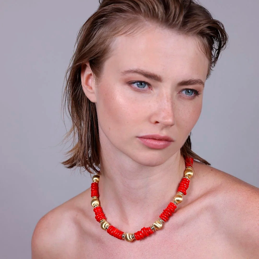 Collana girocollo in Argento 925 placcato Oro giallo 18kt con pietre naturali di corallo bambù (11/12 mm), alternate a bead satinate (12 mm) e a maxi rondelle lavorate (9 mm).