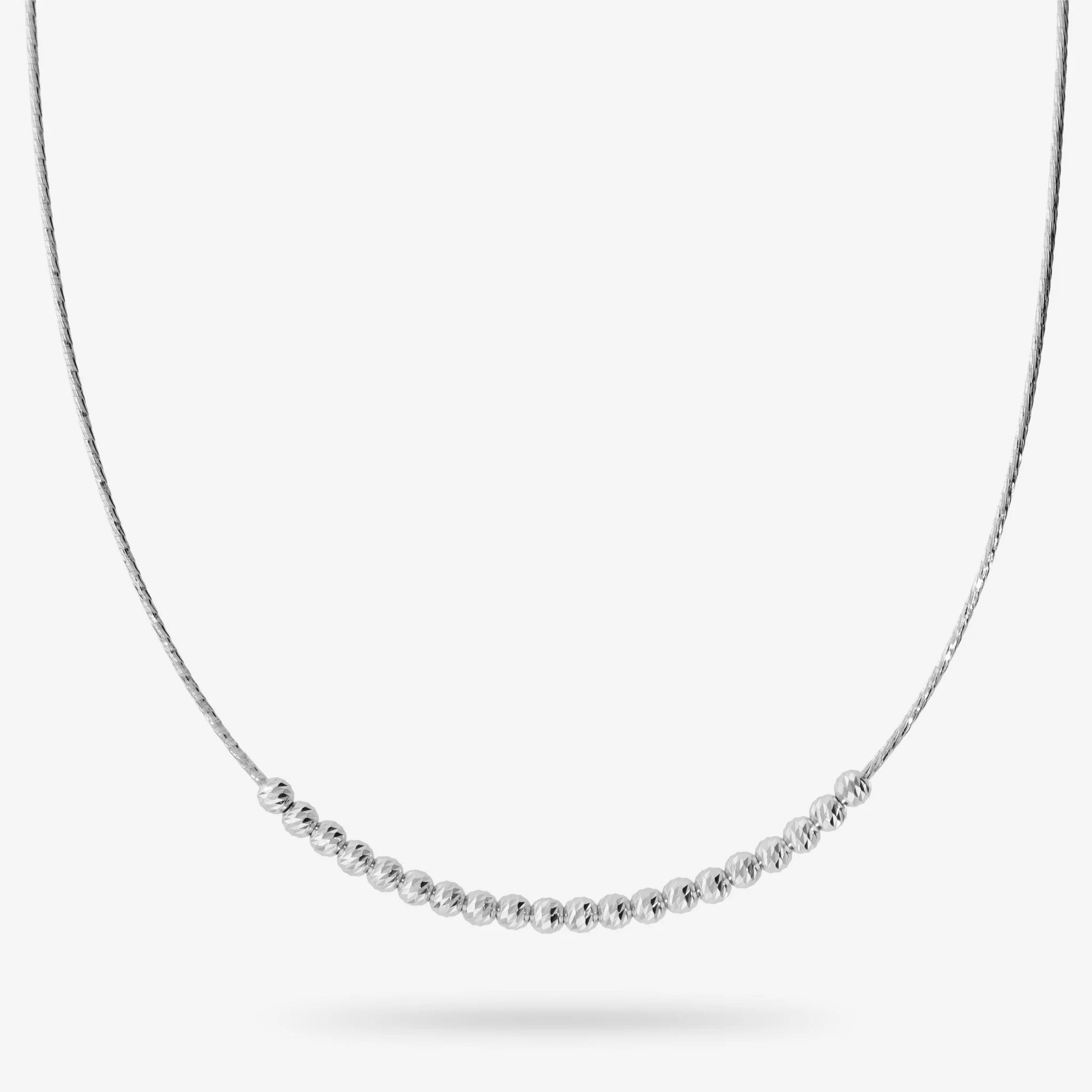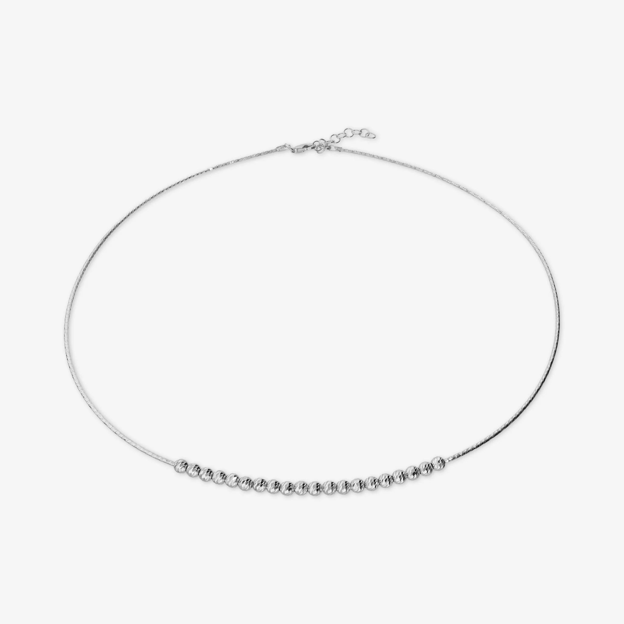 Collana girocollo in Argento 925 placcato Platino. Maglia omega con bead diamantate scorrevoli lungo la catena. Lunghezza 45.5+3 cm di estensione. Chiusura a moschettone.