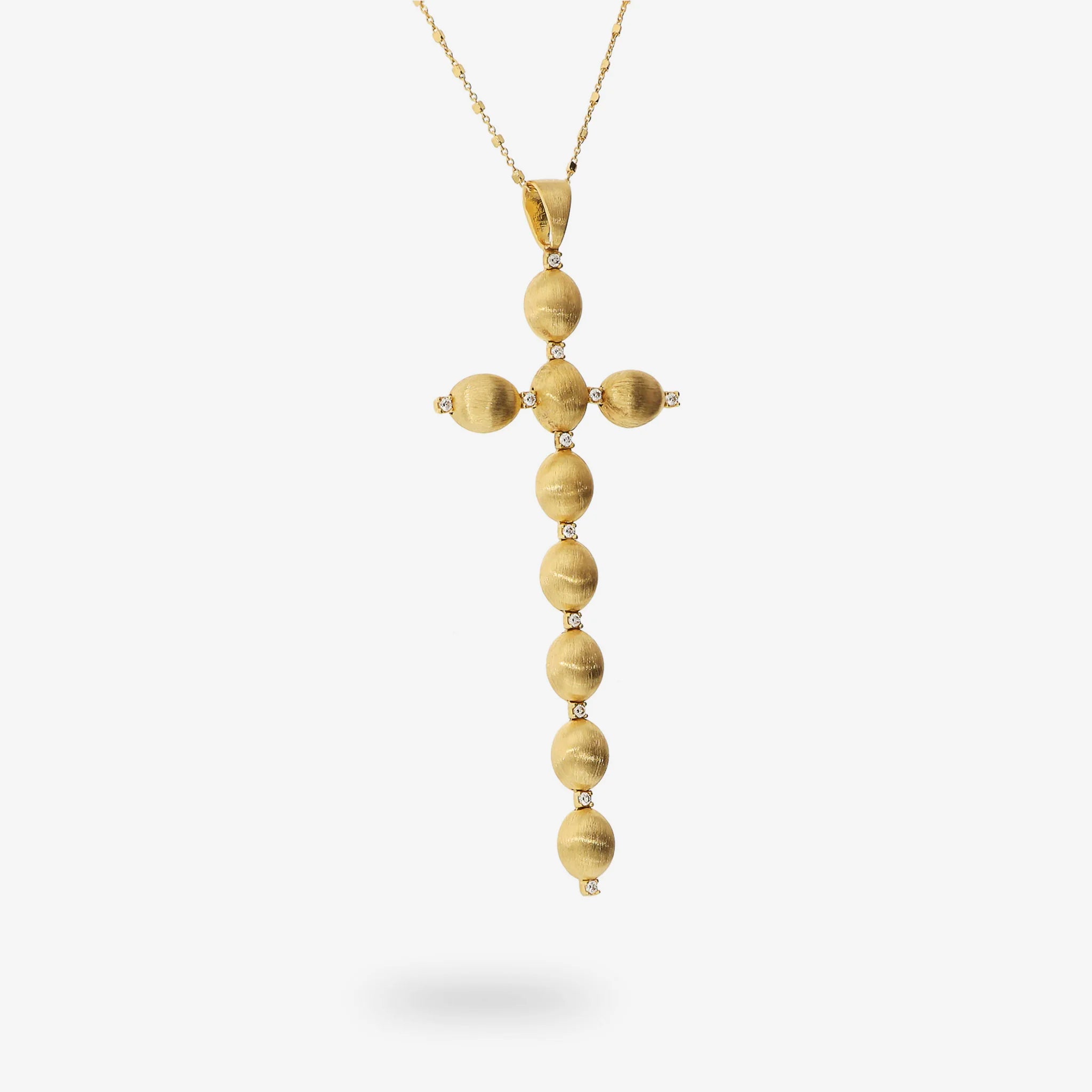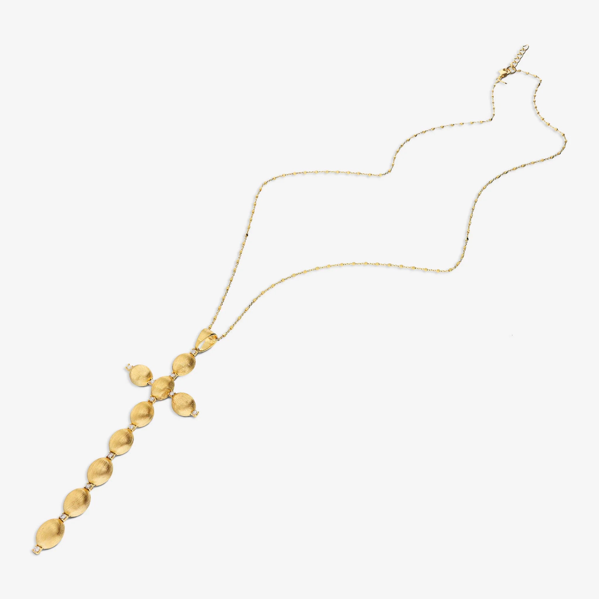 Collana in Argento 925 placcata Oro giallo 18kt. Maglia a cubetti e pendente estraibile a forma di croce (75 mm) con elementi ovali satinati (9x8 mm) e punti luce di cubic zirconia, qualità 'Luminosa'. Lunghezza 60+3 cm di estensione. Chiusura a moschettone.