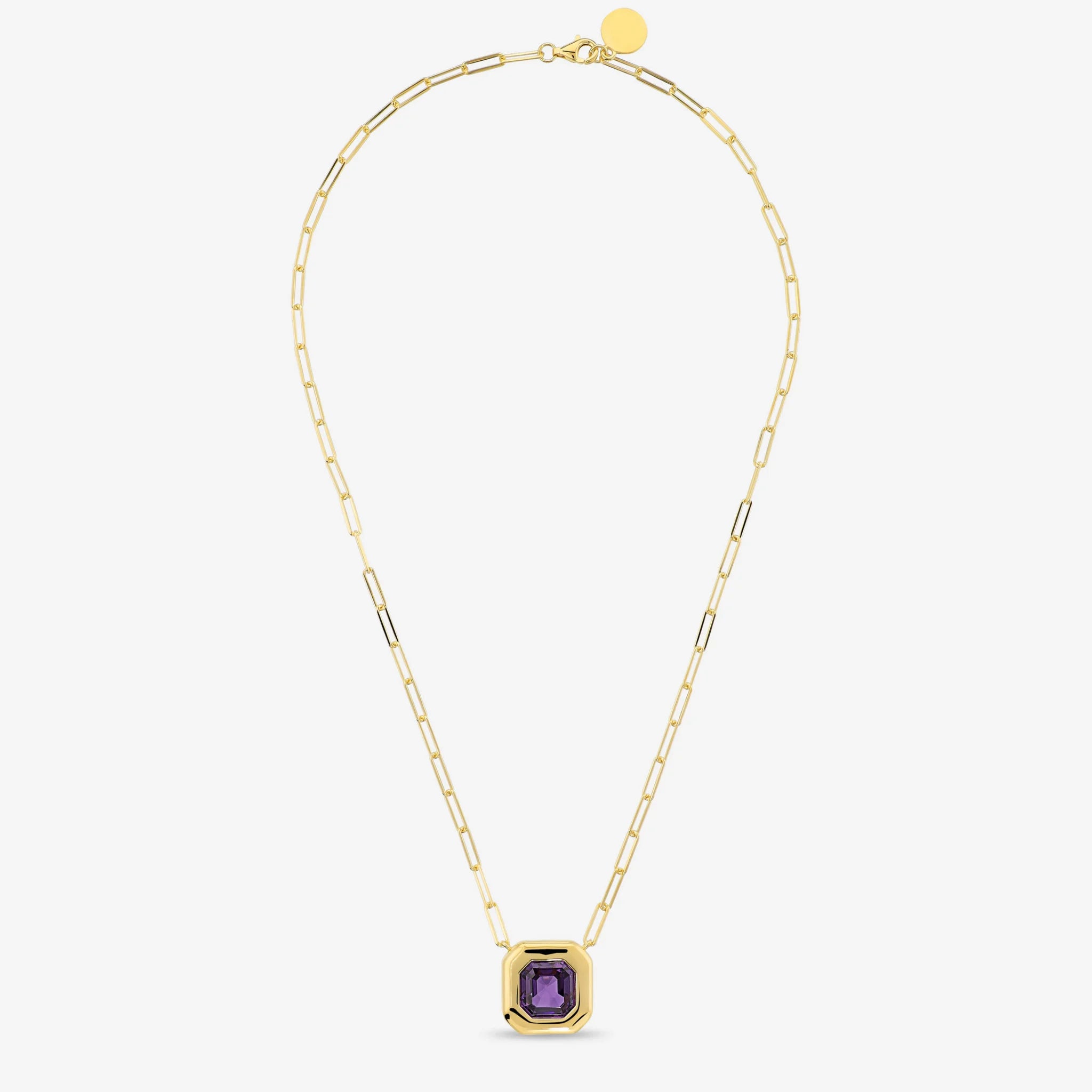 Collana in Argento 925 placcato Oro giallo 18kt. Maglia ovale allungata impreziosita da un pendente quadrato con pietra prisma gem viola, taglio smeraldo (11x9mm). Lunghezza 45 cm. Chiusura a moschettone agganciabile in qualsiasi maglia.