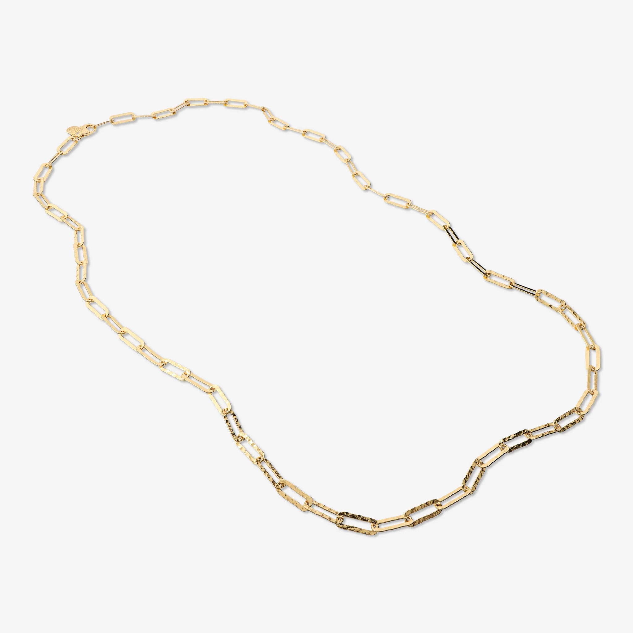 Collana lunga in Argento 925 placcato Oro giallo 18kt. Maglie ovali allungate con finitura leggermente martellata. Lunghezza 80 cm. Chiusura a moschettone.