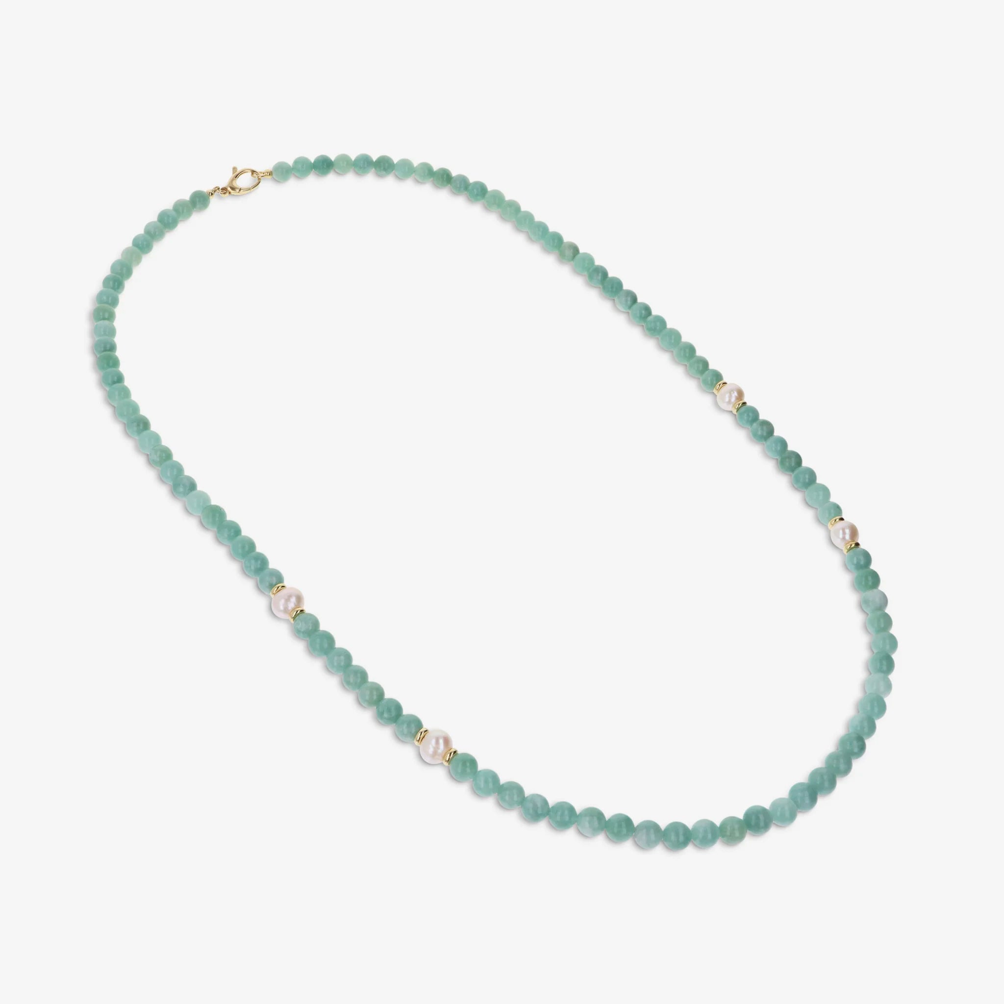 Collana impreziosita da sfere in pietra naturale, quarzite verde, e da quattro perle bianche coltivate d'acqua dolce di alta qualità dalla forma semitonda con diametro di circa 9/10 mm. Lunghezza 80 cm. Chiusura a moschettone in Argento 925 placcato Oro giallo 18kt.