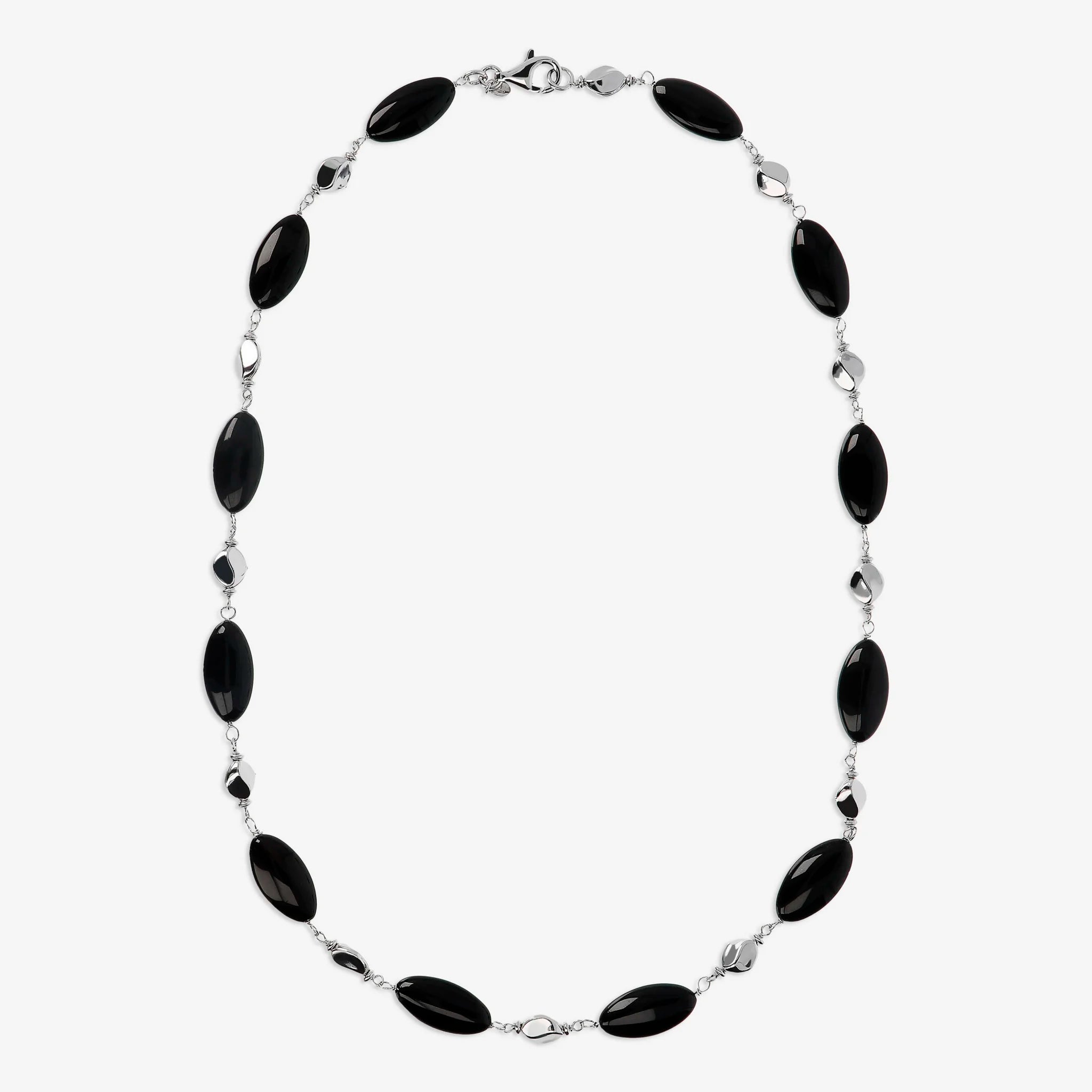 Collana lunga in Argento 925, placcato Platino, con pepite elettroformate lucide alternate a pietre naturali allungate. Lunghezza 60 cm. Chiusura a moschettone.
