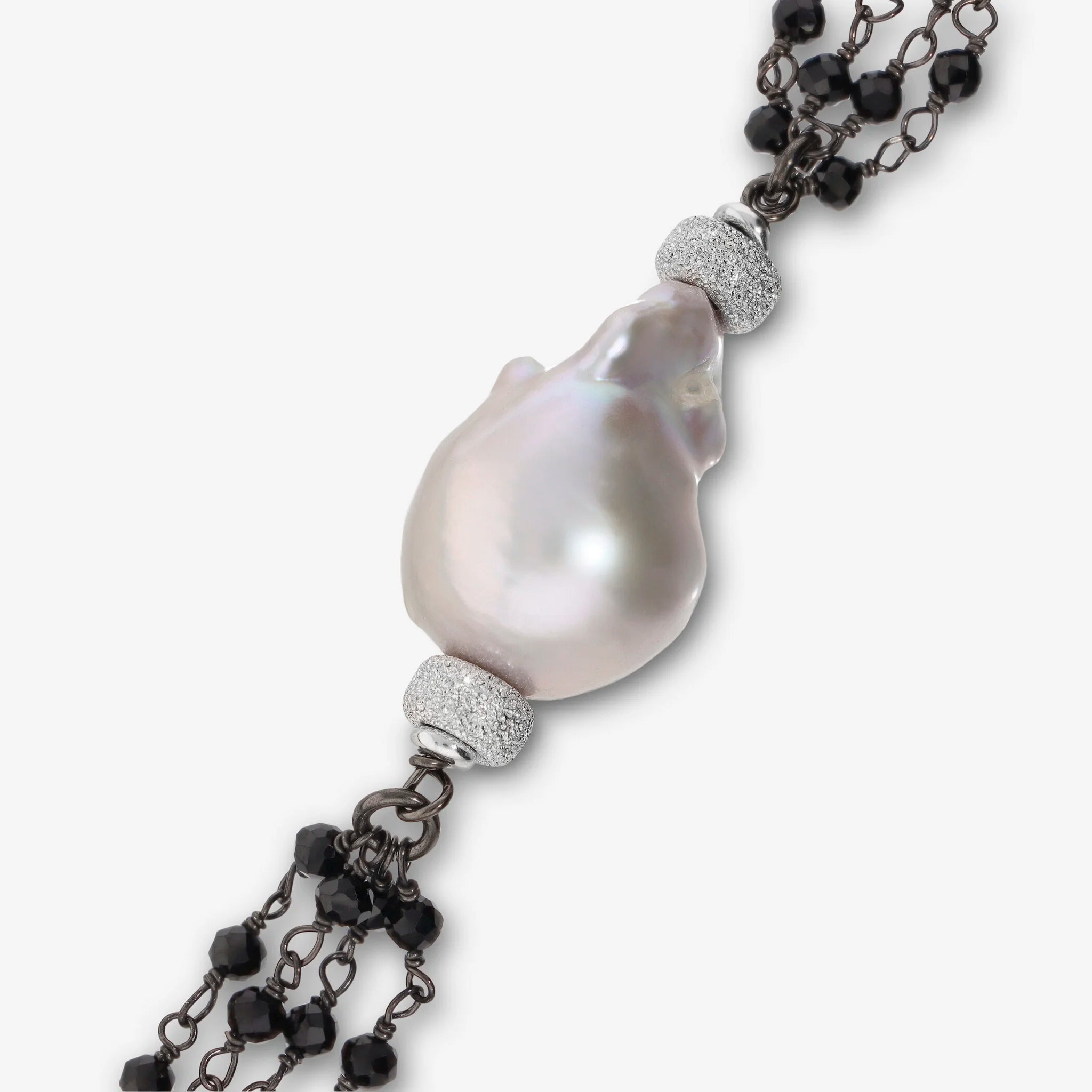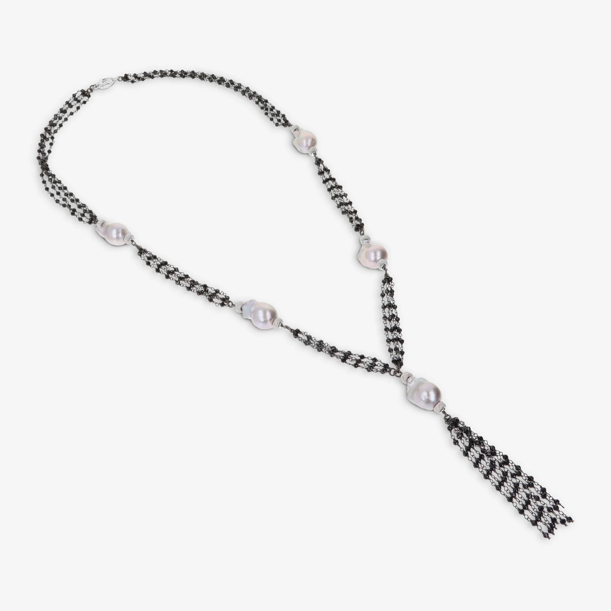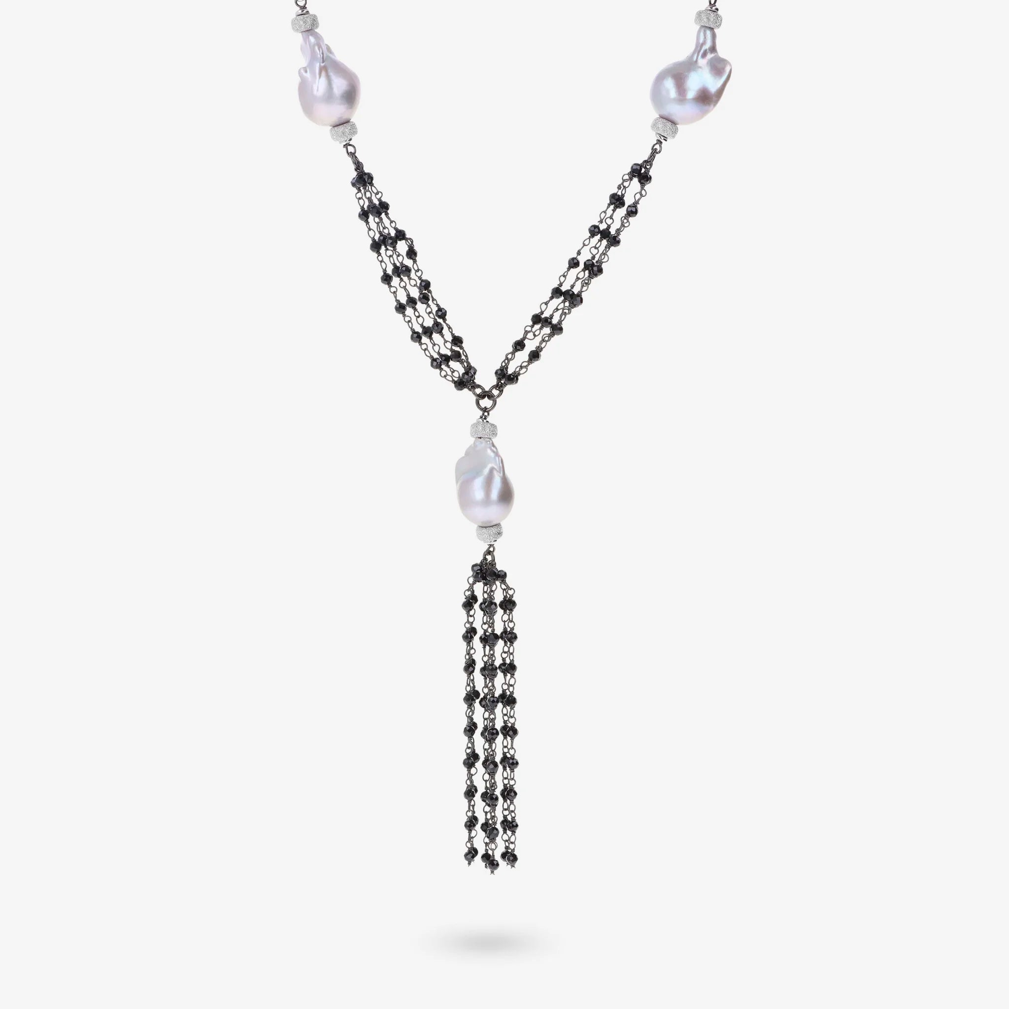 Collana Lunga Multifilo a Cravatta in Argento 925 placcato Rutenio con Spinelli Neri e Perle Scaramazze Grigie d'Acqua Dolce Ø 14/16 mm