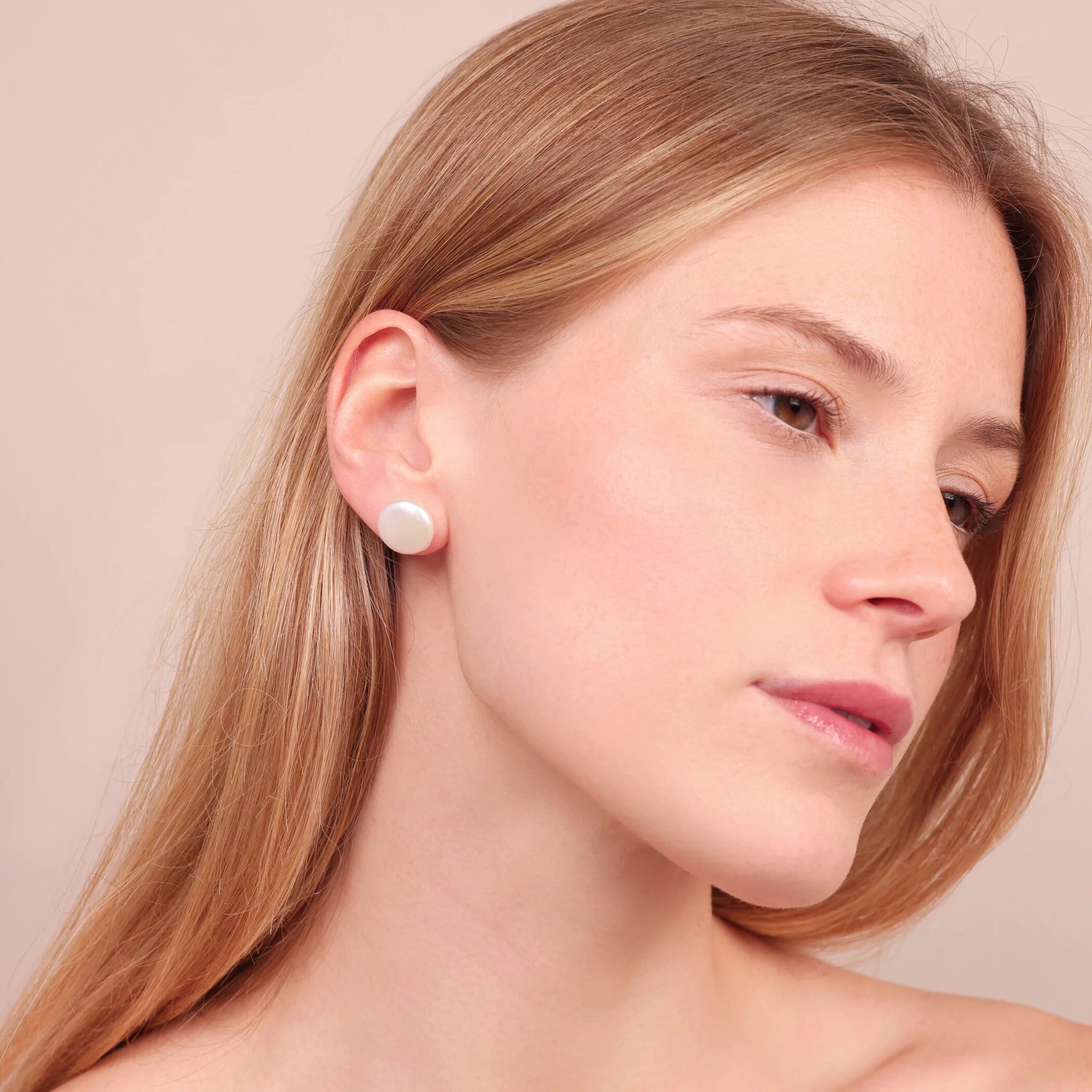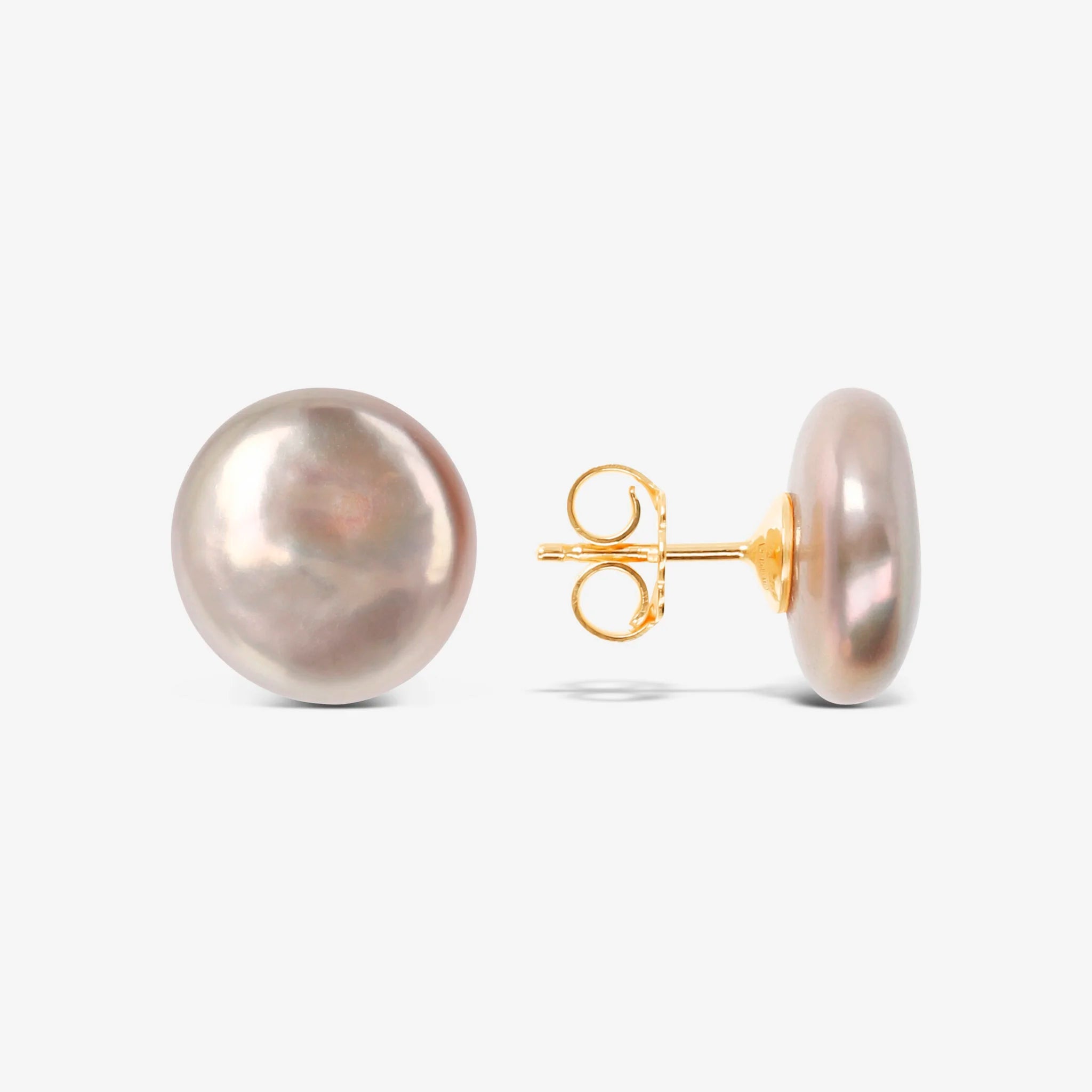 Orecchini a bottone con perle Coin coltivate d'acqua dolce con diametro di circa 13/14 mm. Chiusura a perno e farfallina in Argento 925 placcata Oro 18kt.