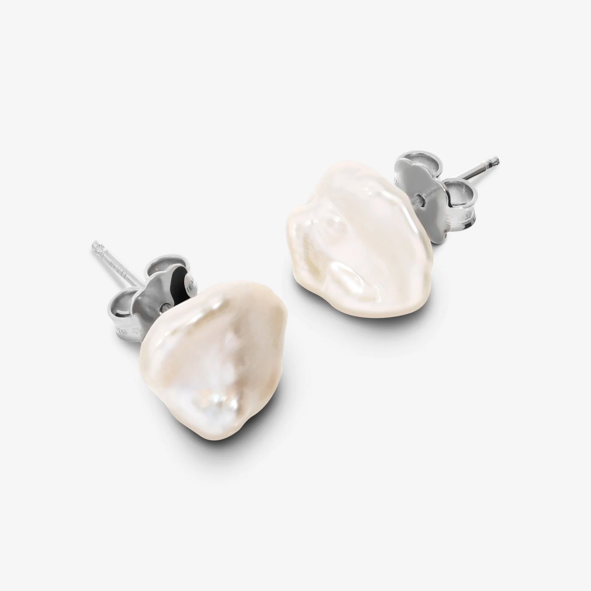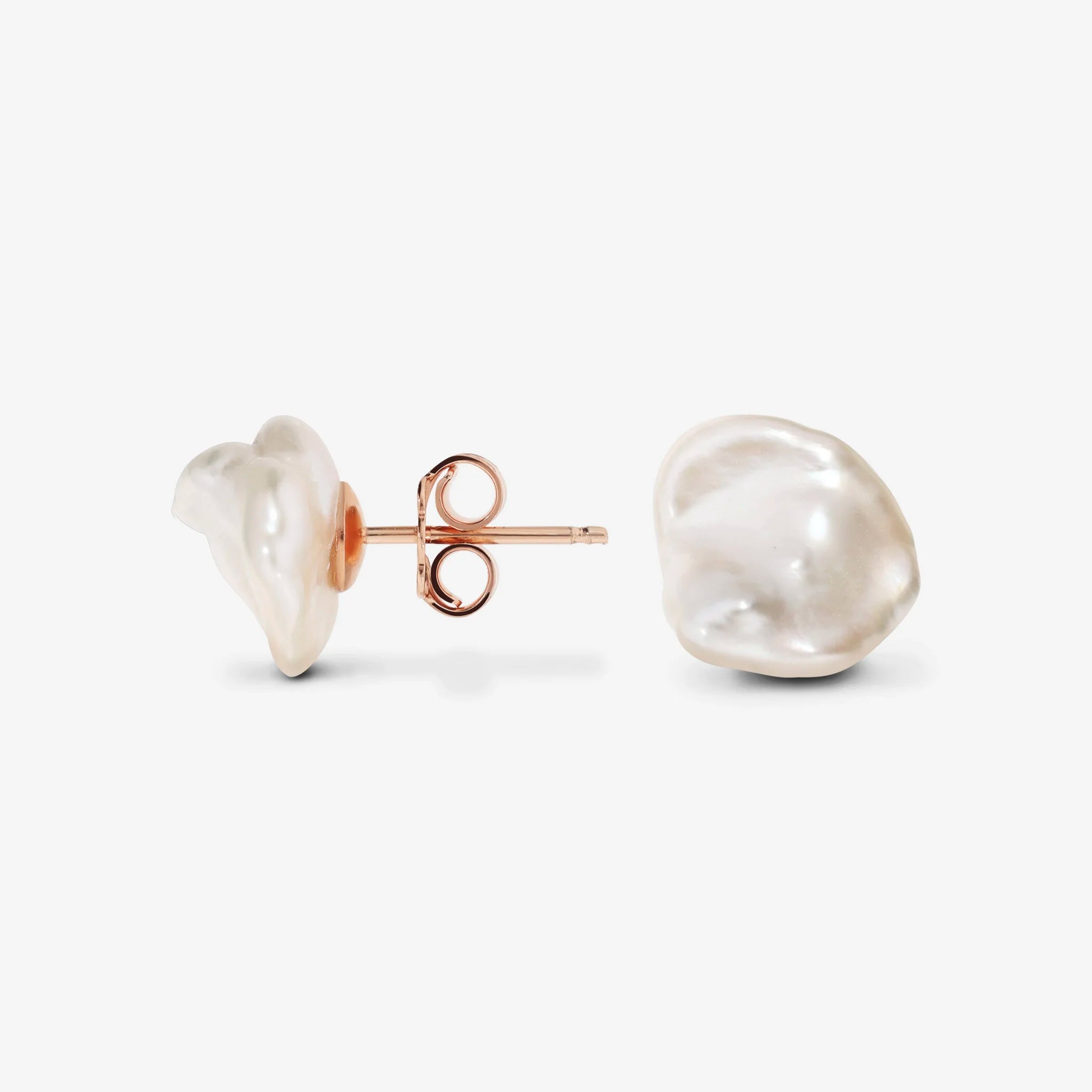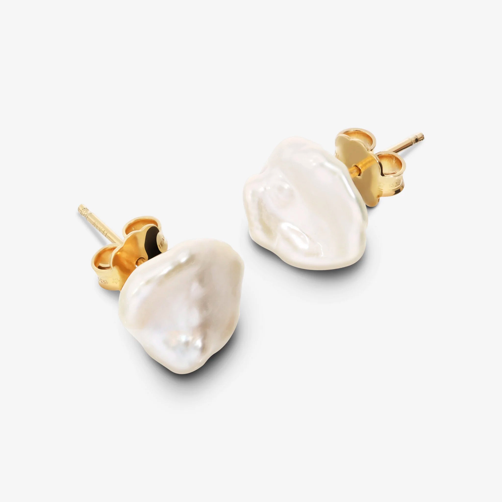 Orecchini a bottone con perle Barocche 'Keshi' coltivate d'acqua dolce bianche con diametro di circa 10 mm. Chiusura a perno e farfallina in Argento 925 placcata Oro 18kt. Le perle 'Keshi' sono perle Barocche dalla caratteristica forma irregolare che ne rende ognuna un pezzo unico.