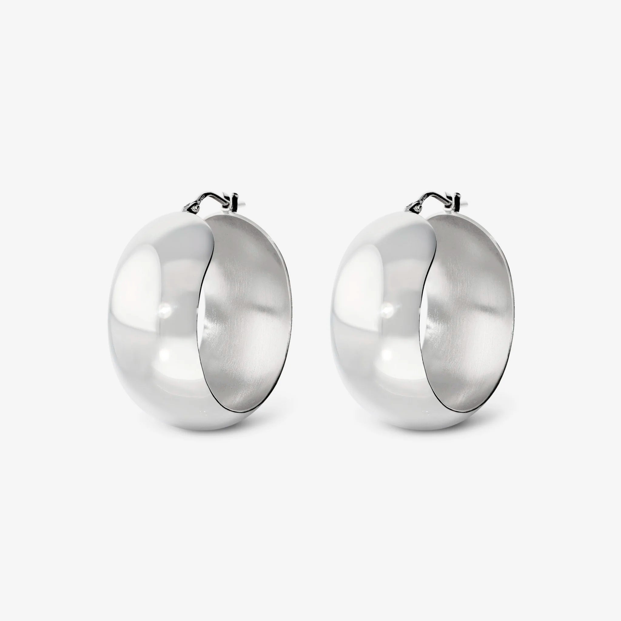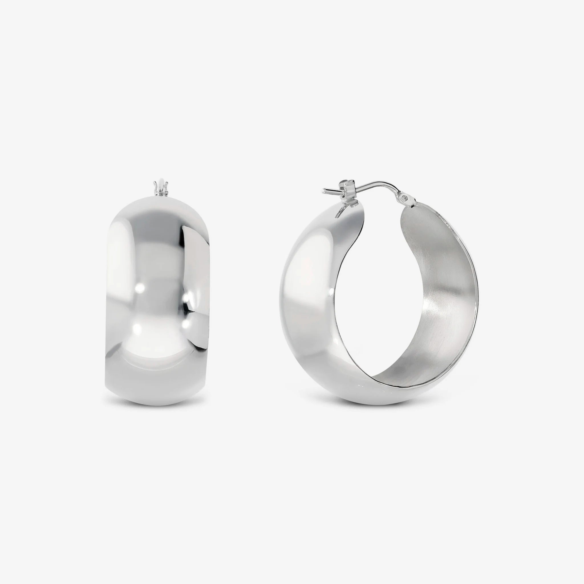 Orecchini a cerchio in Argento 925 placcato Platino. Finitura lucida. Diametro esterno 2.5 cm. Larghezza 1.4 cm. Chiusura a baionetta.