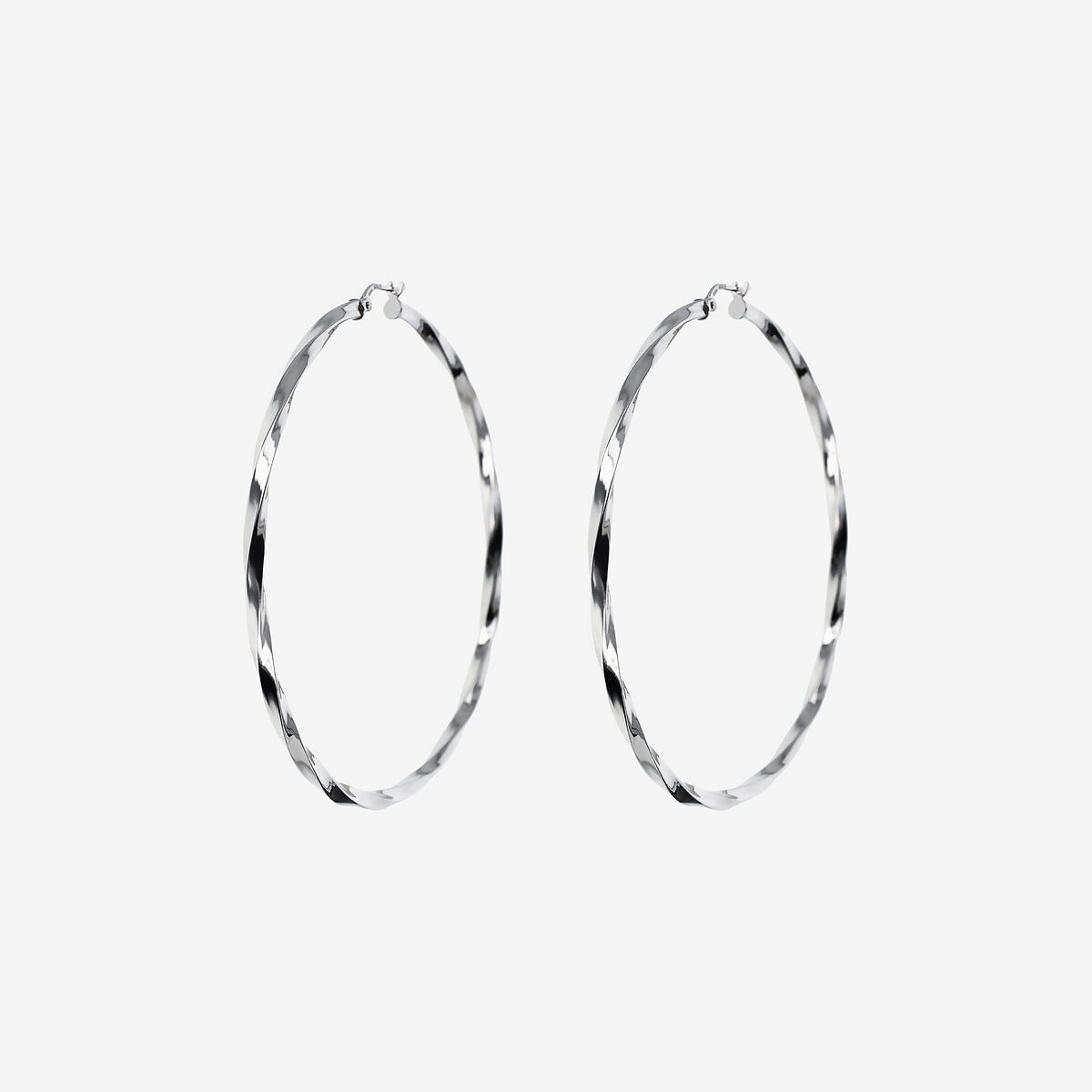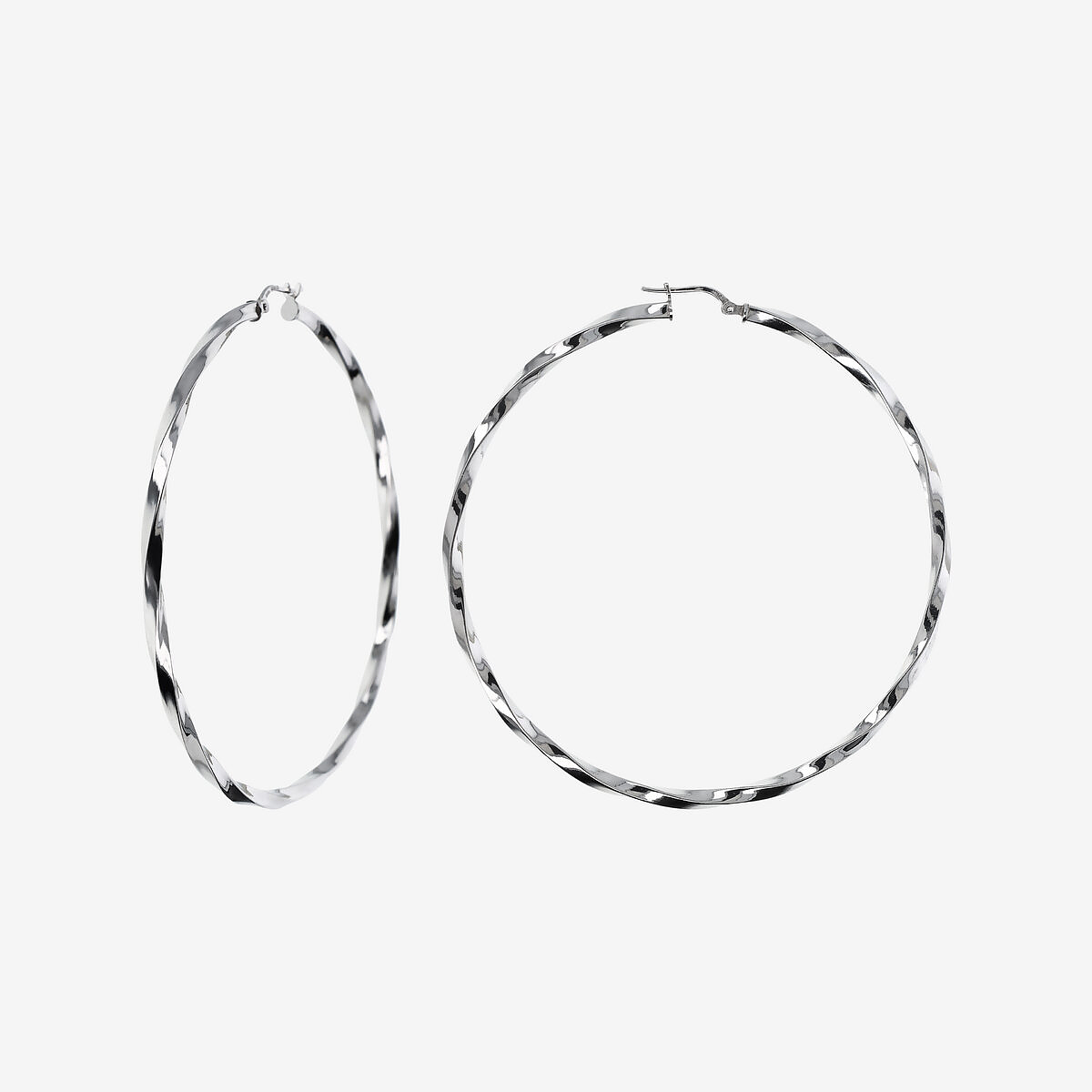 Orecchini a cerchio in Argento 925 placcato Platino. Superficie lucida con finitura ritorta. Diametro esterno 7 cm. Chiusura a baionetta.