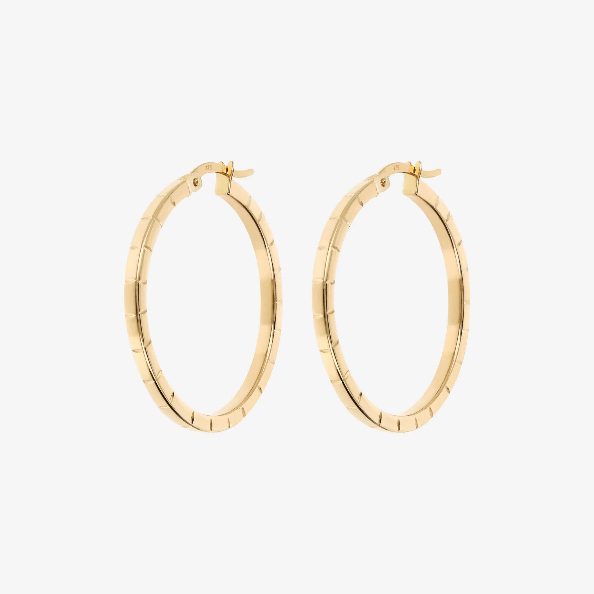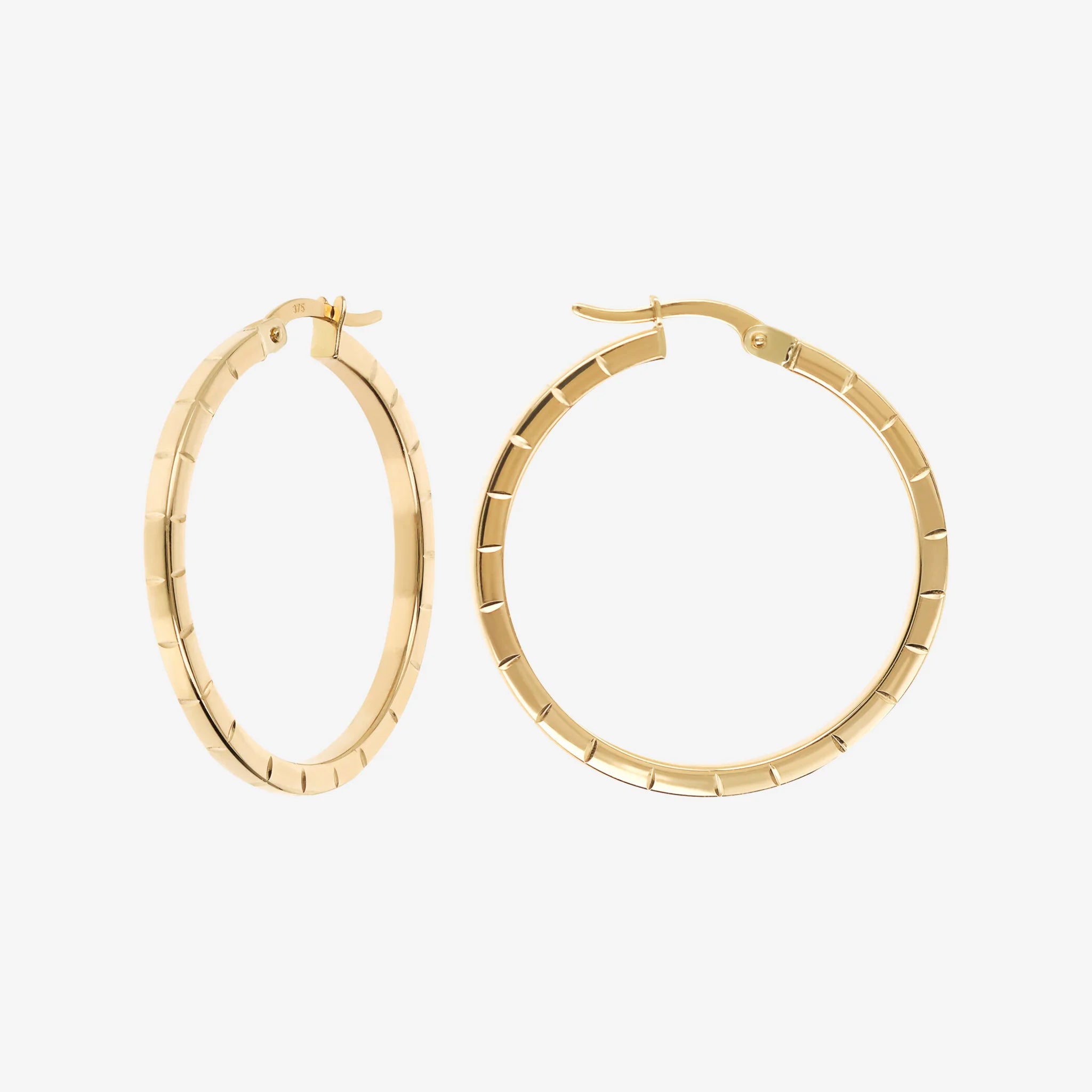 Orecchini a cerchio in Oro 375/1000 con superficie lavorata. Finitura lucida. Chiusura a baionetta. Diametro esterno 2.5 cm.