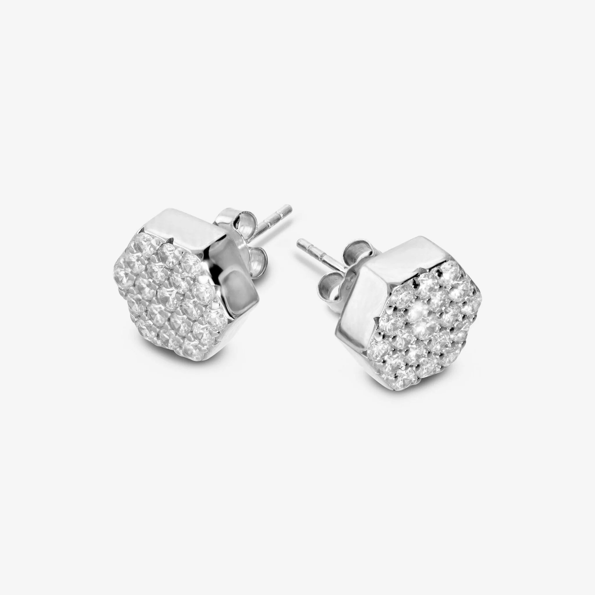 Orecchini a lobo in Argento 925, placcato Platino, dal design esagonale (12 mm) con superficie in pavé di cubic zirconia, qualità 'Luminosa'. Chiusura a perno e farfallina.