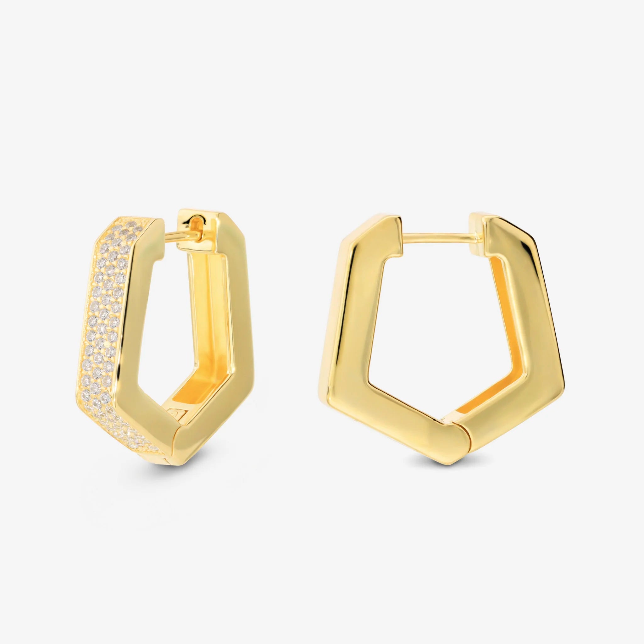 Orecchini a cerchio in Argento 925, placcato Oro giallo 18kt, dal design esagonale (20x19 mm) con cubic zirconia, qualità 'Luminosa'. Finitura lucida. Chiusura con perno a incastro.
