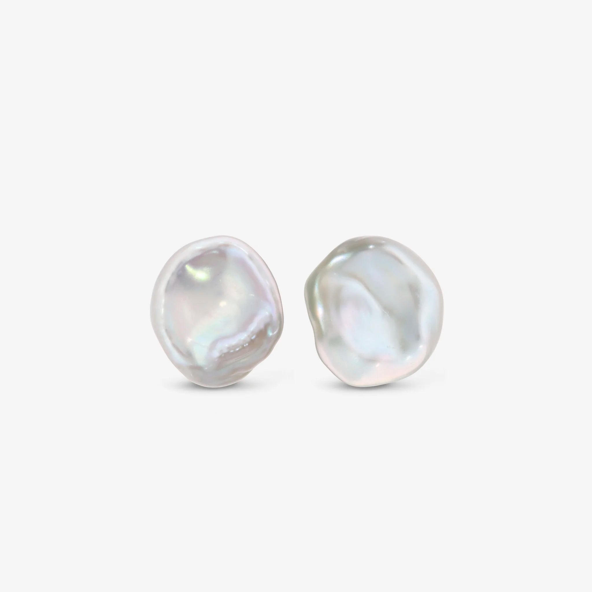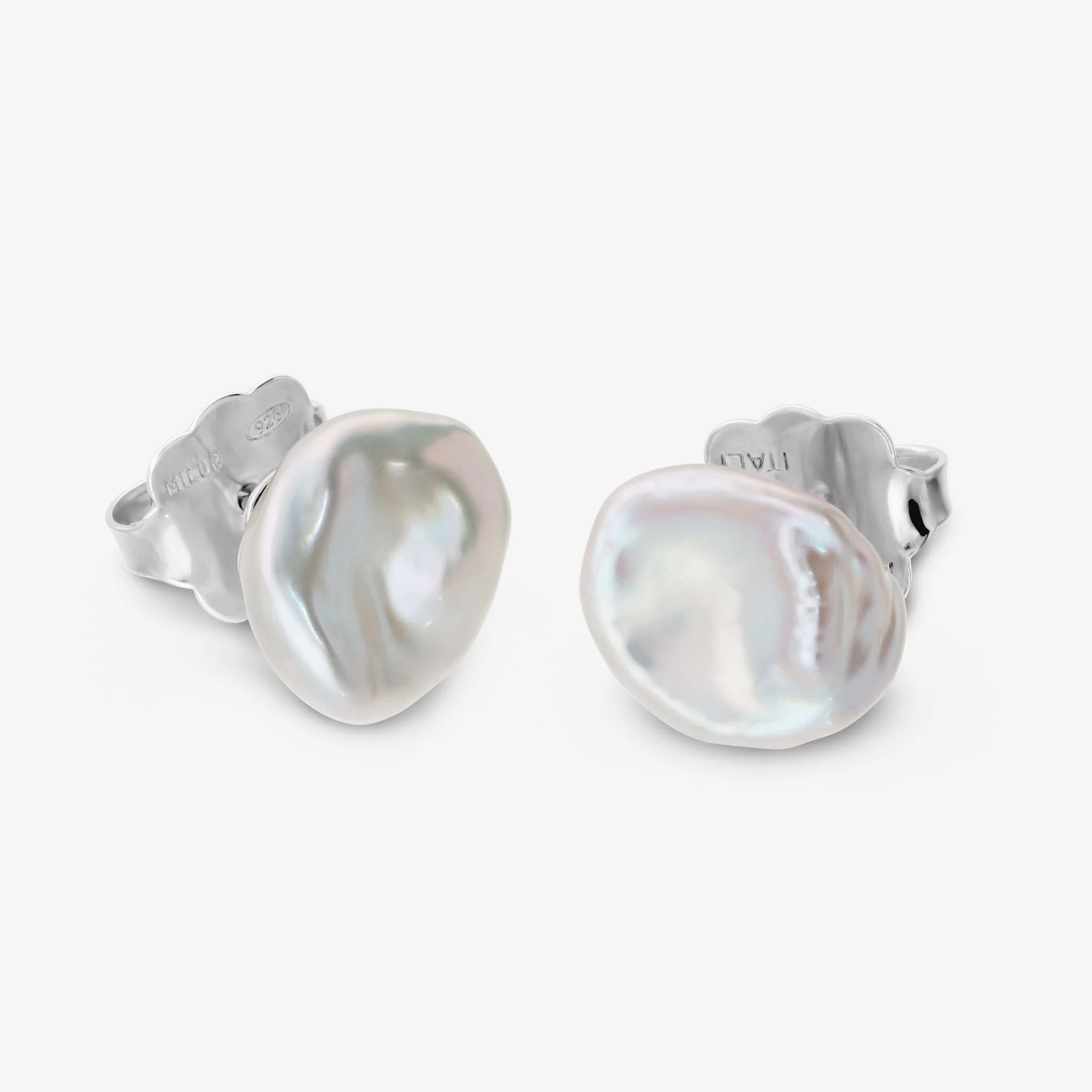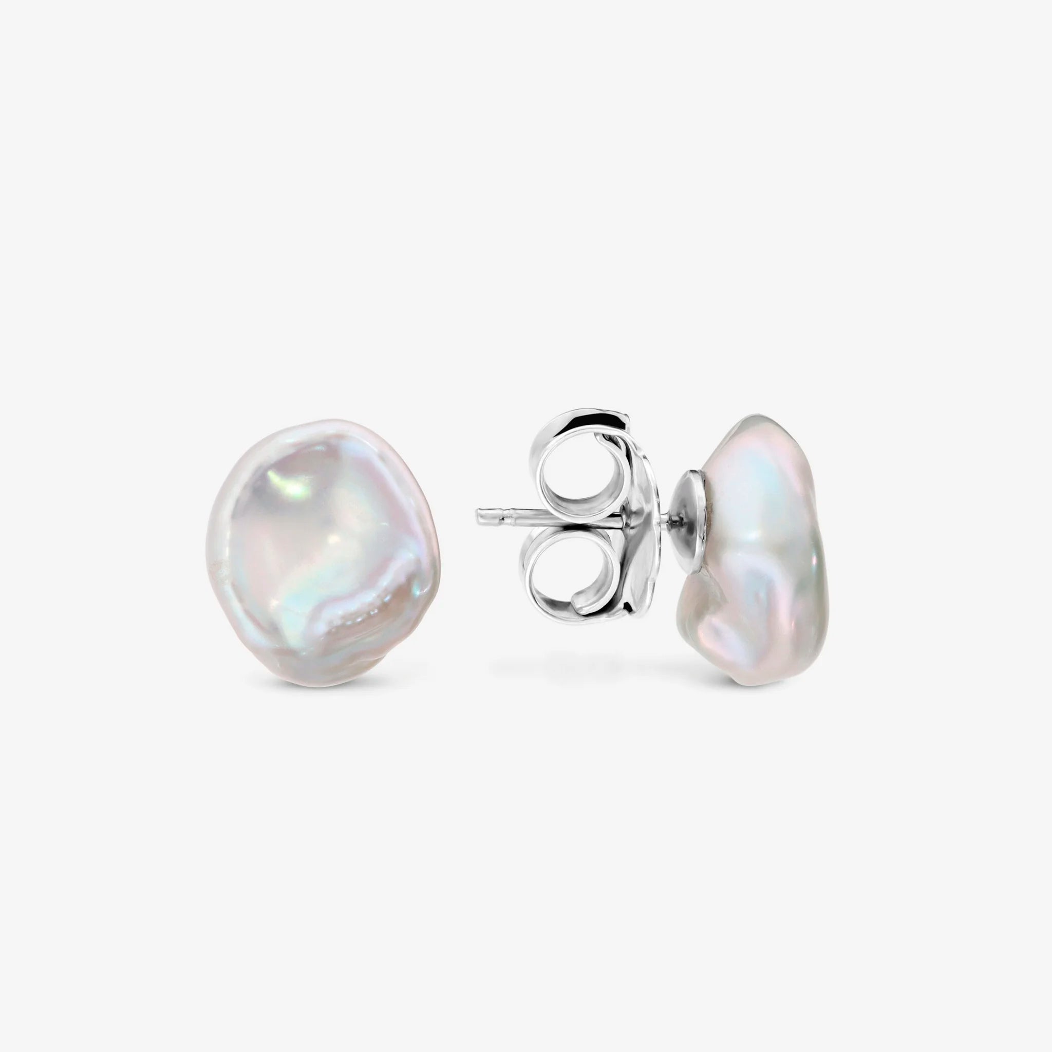 Orecchini a bottone con perle Keshi coltivate d'acqua dolce con diametro di circa 11/12 mm. Chiusura a perno e farfallina in Argento 925 placcato Oro bianco 18kt. Le perle Keshi sono perle Barocche dalla caratteristica forma irregolare che ne rende ognuna un pezzo unico.