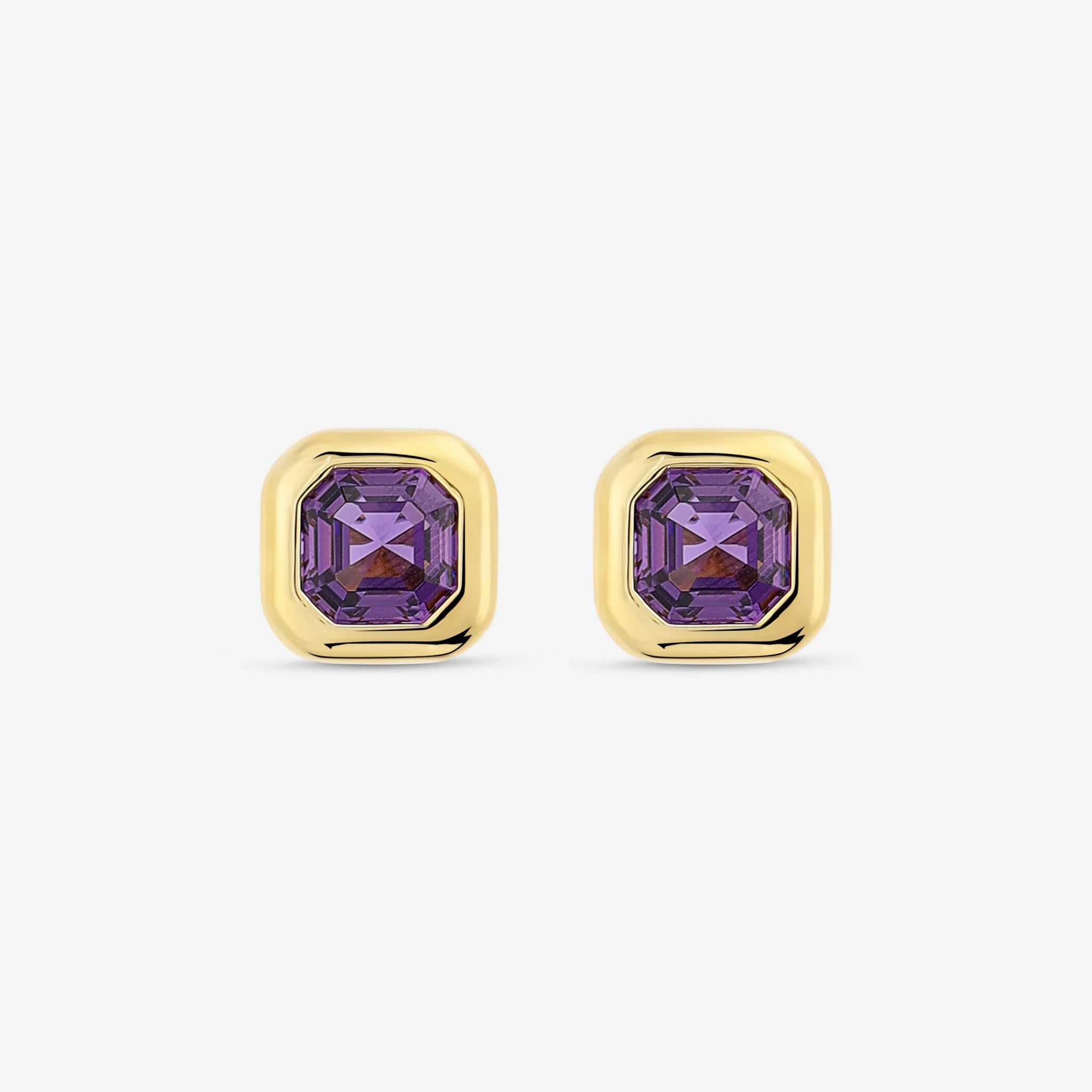 Orecchini a lobo in Argento 925, placcato Oro giallo 18kt, con pietre di prisma gem viola, taglio smeraldo (10x8mm). Finitura lucida. Chiusura a perno e farfallina.