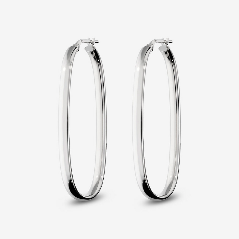 Orecchini ovali allungati large in Argento 925 placcati Platino. Superficie lucida a specchio. Chiusura a baionetta.