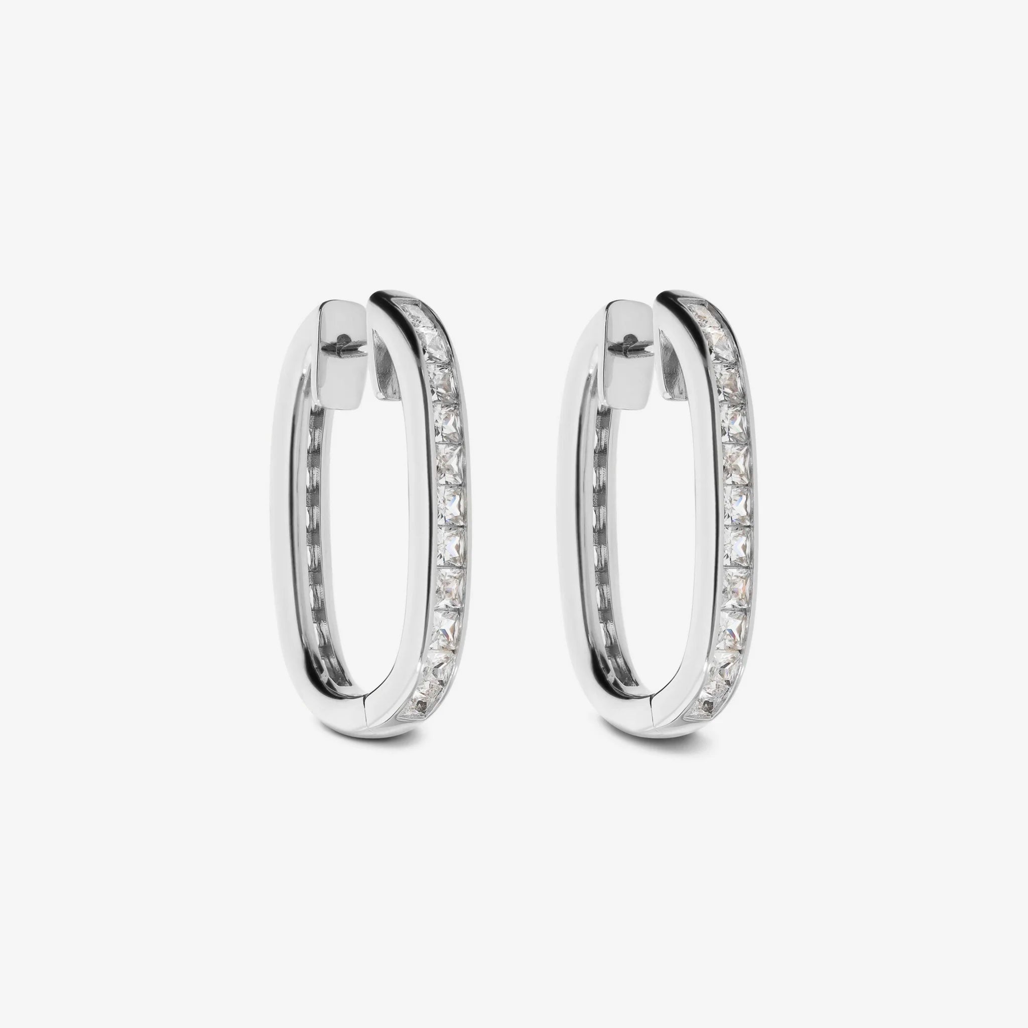 Orecchini ovali in Argento 925 con cubic zirconia (2.5x2.5 mm), qualità 'Luminosa', pari a 4ct. Dimensioni orecchino 28x18 mm. Chiusura con perno a incastro.