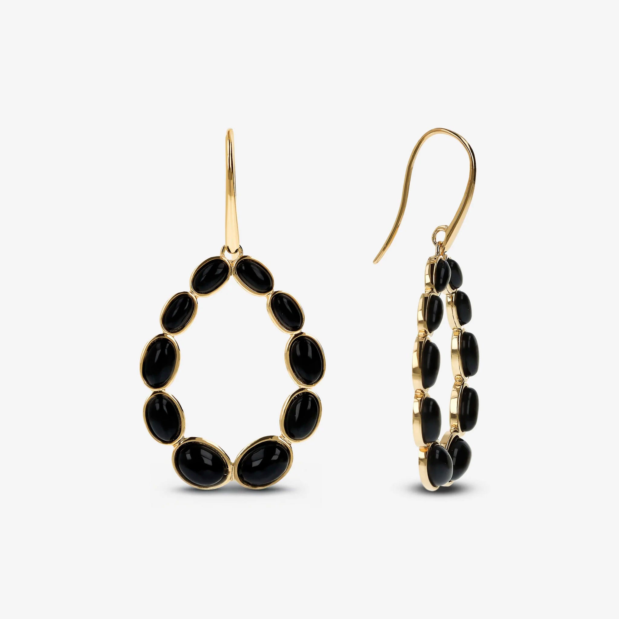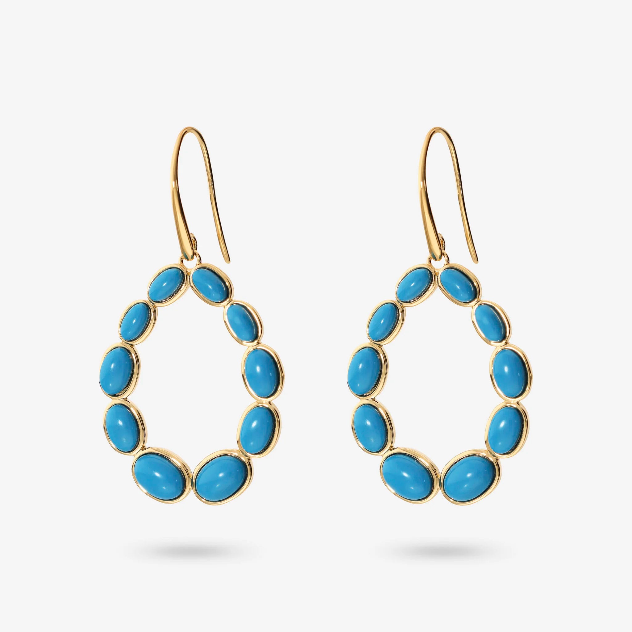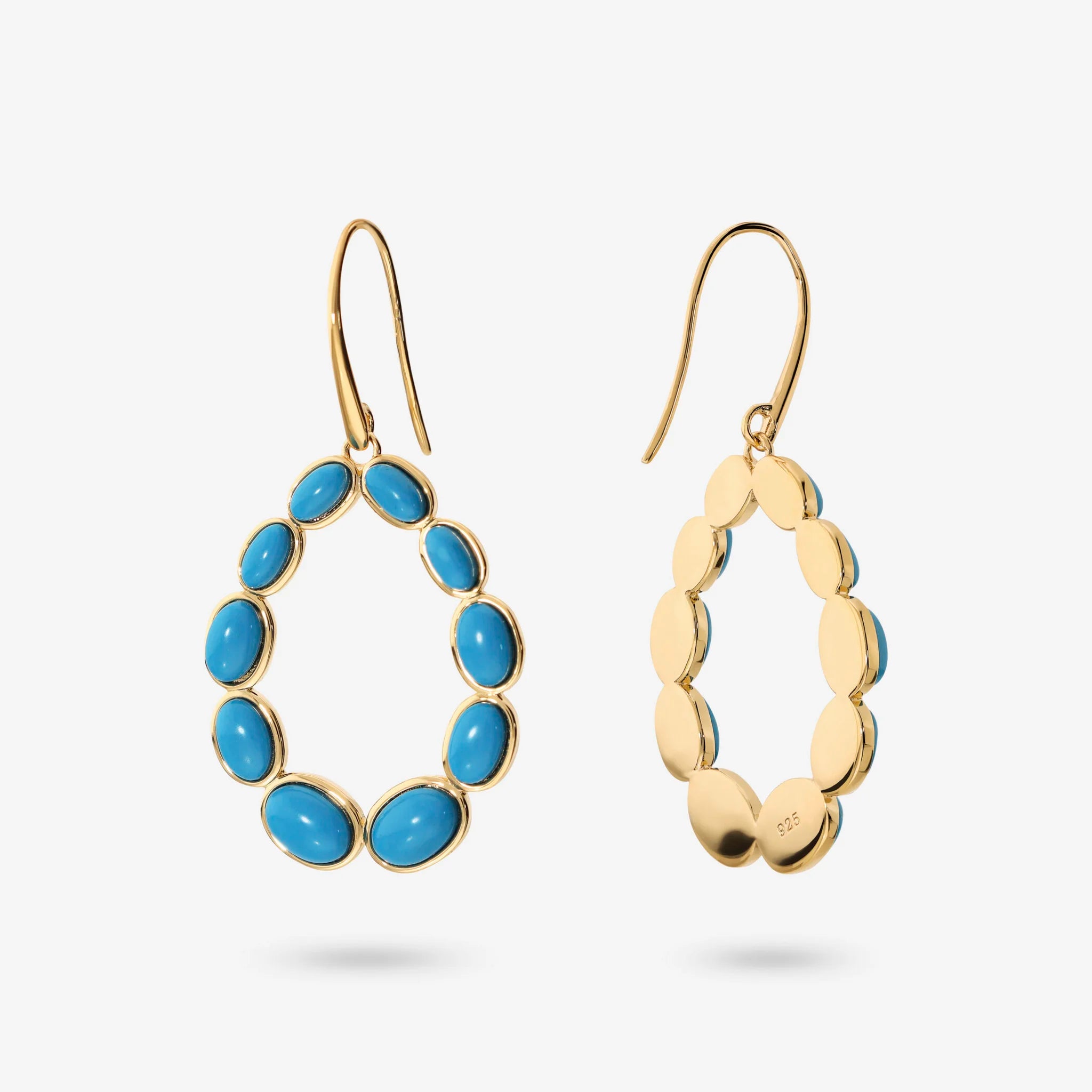 Orecchini pendenti in Argento 925 placcato Oro giallo 18kt con pietre naturali di onice nero o turchese, taglio a goccia. Lunghezza 4.5 cm. Chiusura ad amo.