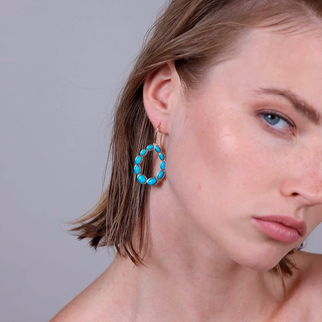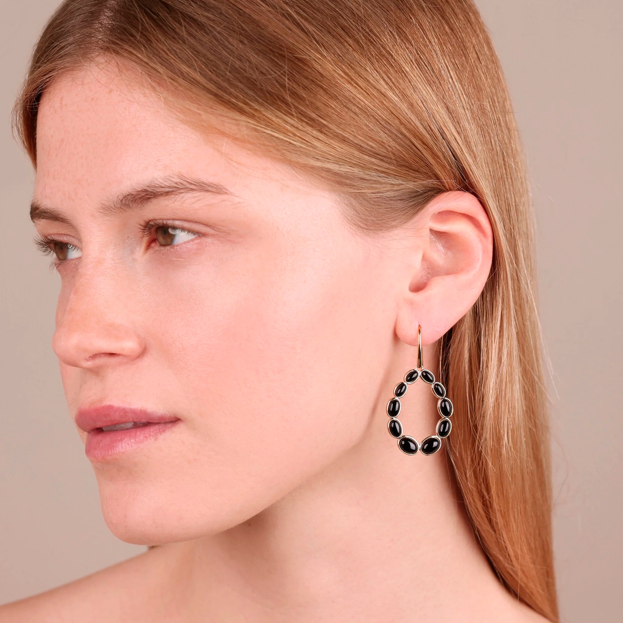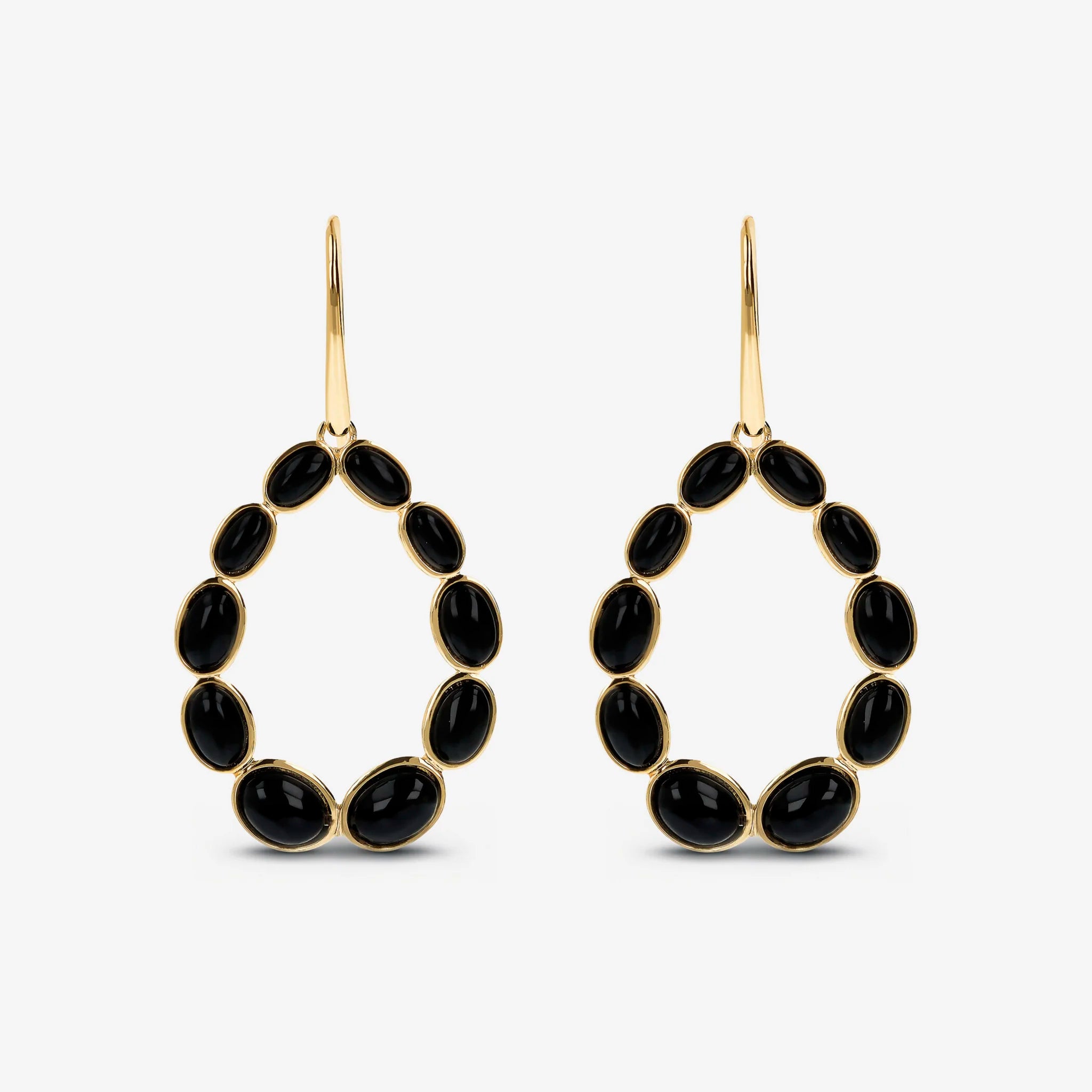 Orecchini pendenti in Argento 925 placcato Oro giallo 18kt con pietre naturali di onice nero o turchese, taglio a goccia. Lunghezza 4.5 cm. Chiusura ad amo.