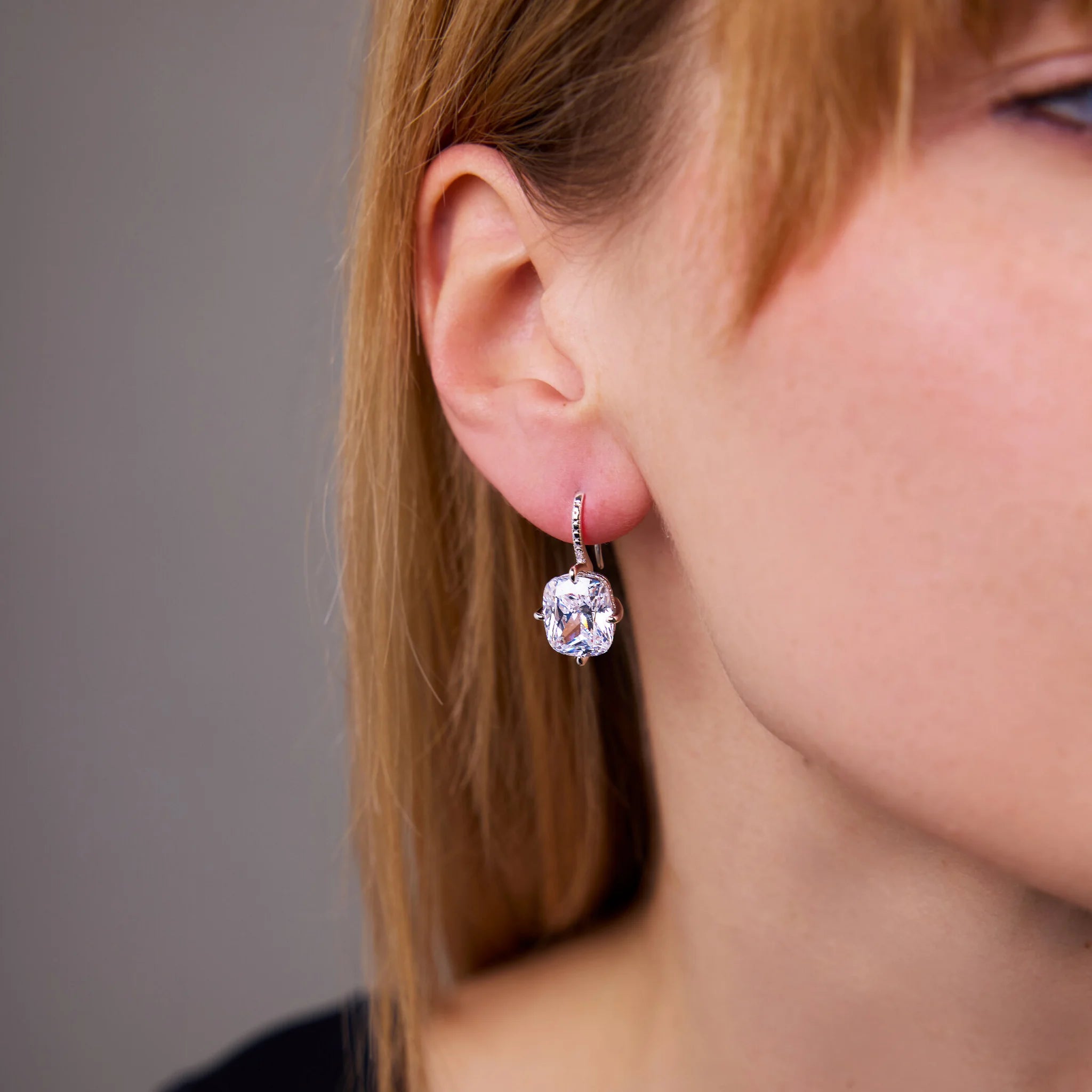 Orecchini pendenti in Argento 925, placcato Platino, con due pietre di cubic zirconia, qualità 'Luminosa', pari a 20ct. Lunghezza 3 cm. Chiusura ad amo con pavé di cubic zirconia, pari a 0.14ct.